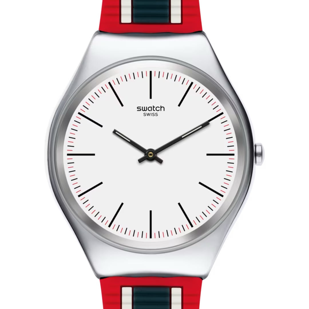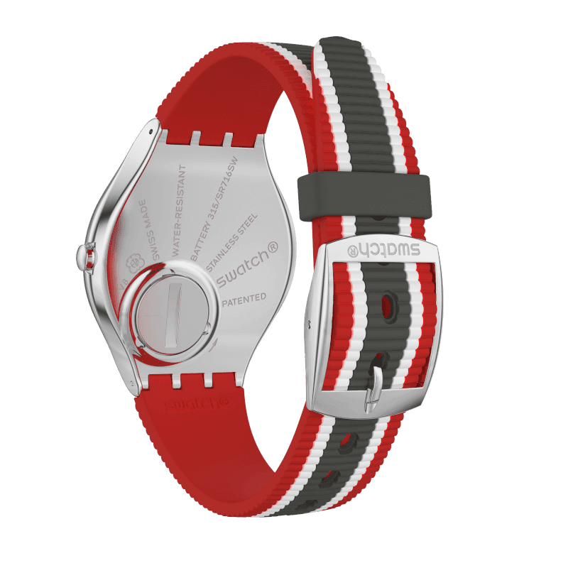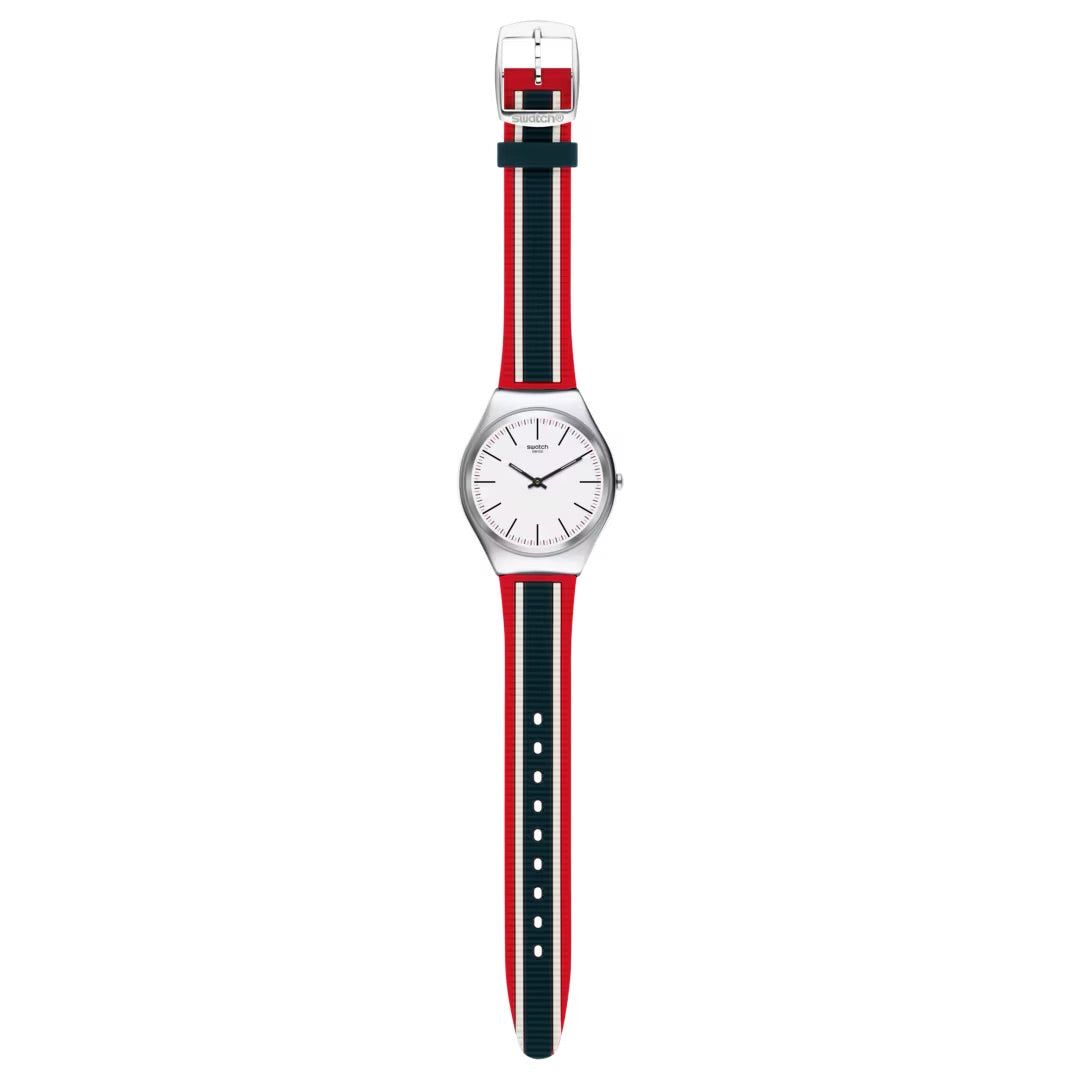 Orologio solo tempo unisex di Swatch della collezione Skin Irony SkinFlag. Cassa in acciaio lucido ultra piatta del diametro di 38 mm, quadrante bianco con indici neri, sfere nere, cinturino in silicone a righe rosse, nere e bianche, chiusura fibbia in acciaio. Resistenza all'acqua 3 atm. Movimento al quarzo Swiss Made.
