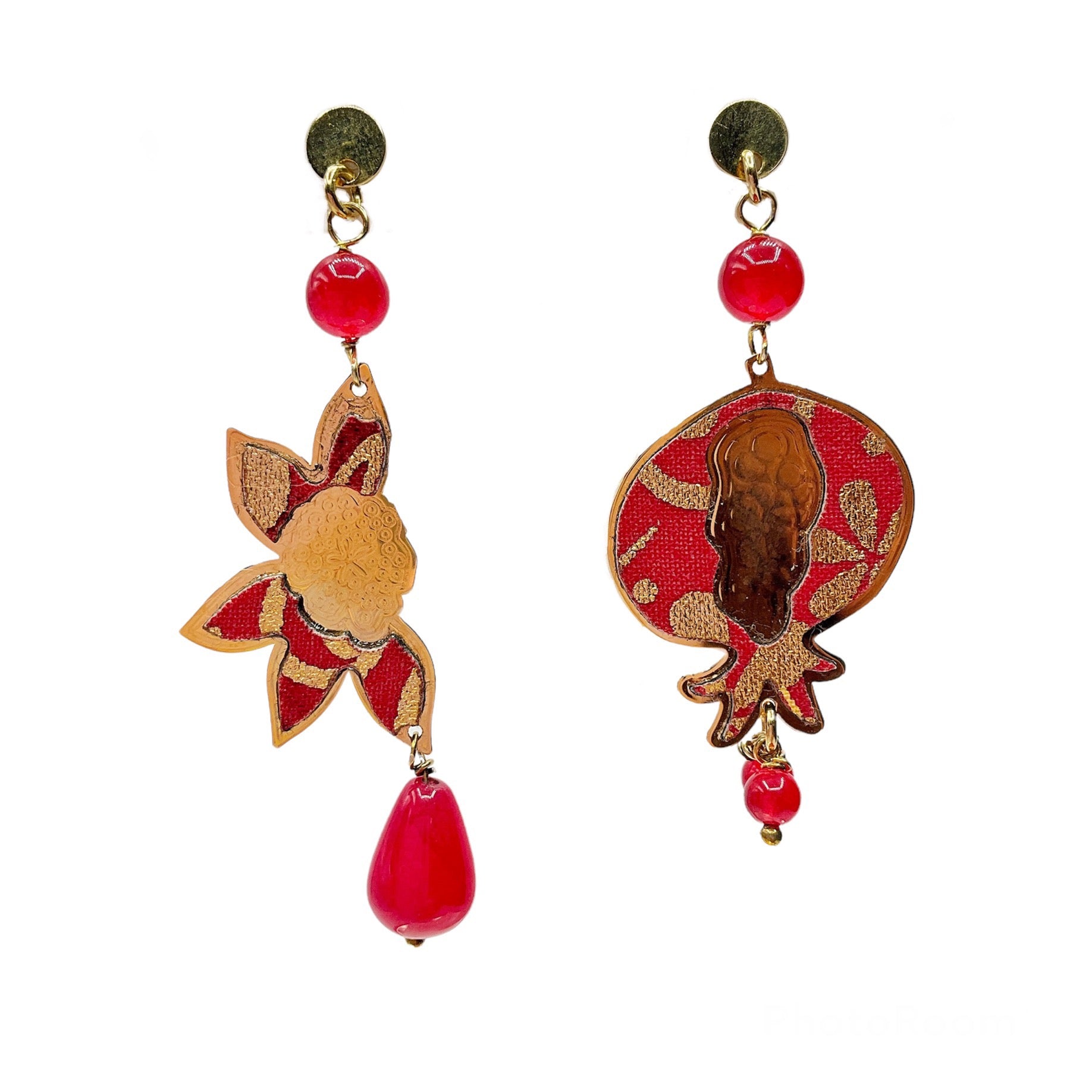 Orecchini in argento 925 galvanizzato oro e sete indiane. Lunghezza orecchino melagrana 6 cm. Chiusura perno e farfalla. Made in Italy.