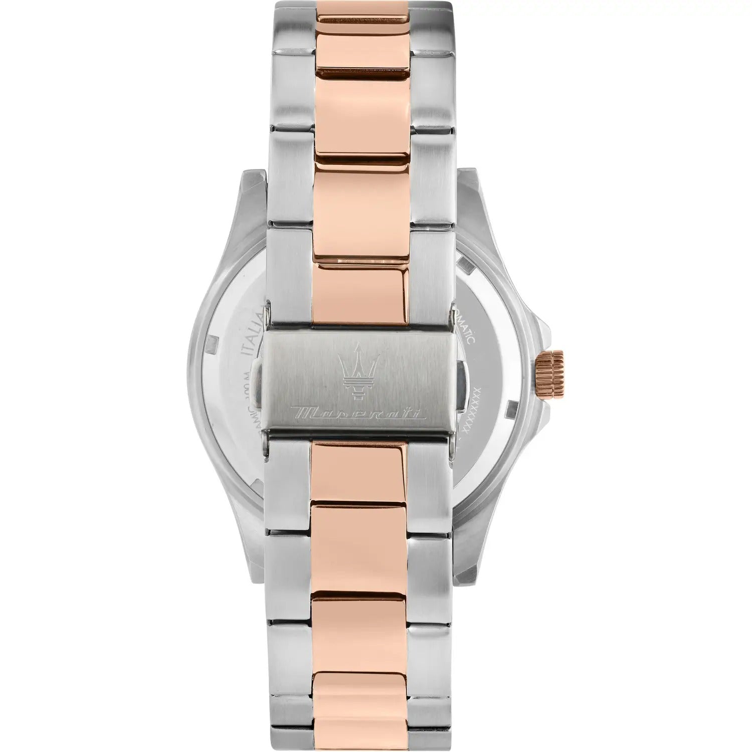 Orologio solo tempo automatico da uomo di Maserati della collezione Competizione. Cassa in acciaio del diametro di 43 mm, quadrante di colore blu con indici rosa, ghiera zigrinata in acciaio rosato con ceramica blu. Bracciale in acciaio bicolore rosa. Vetro zaffiro, fondello chiuso a vite con movimento a vista. Resistenza all'acqua di a10 atm.