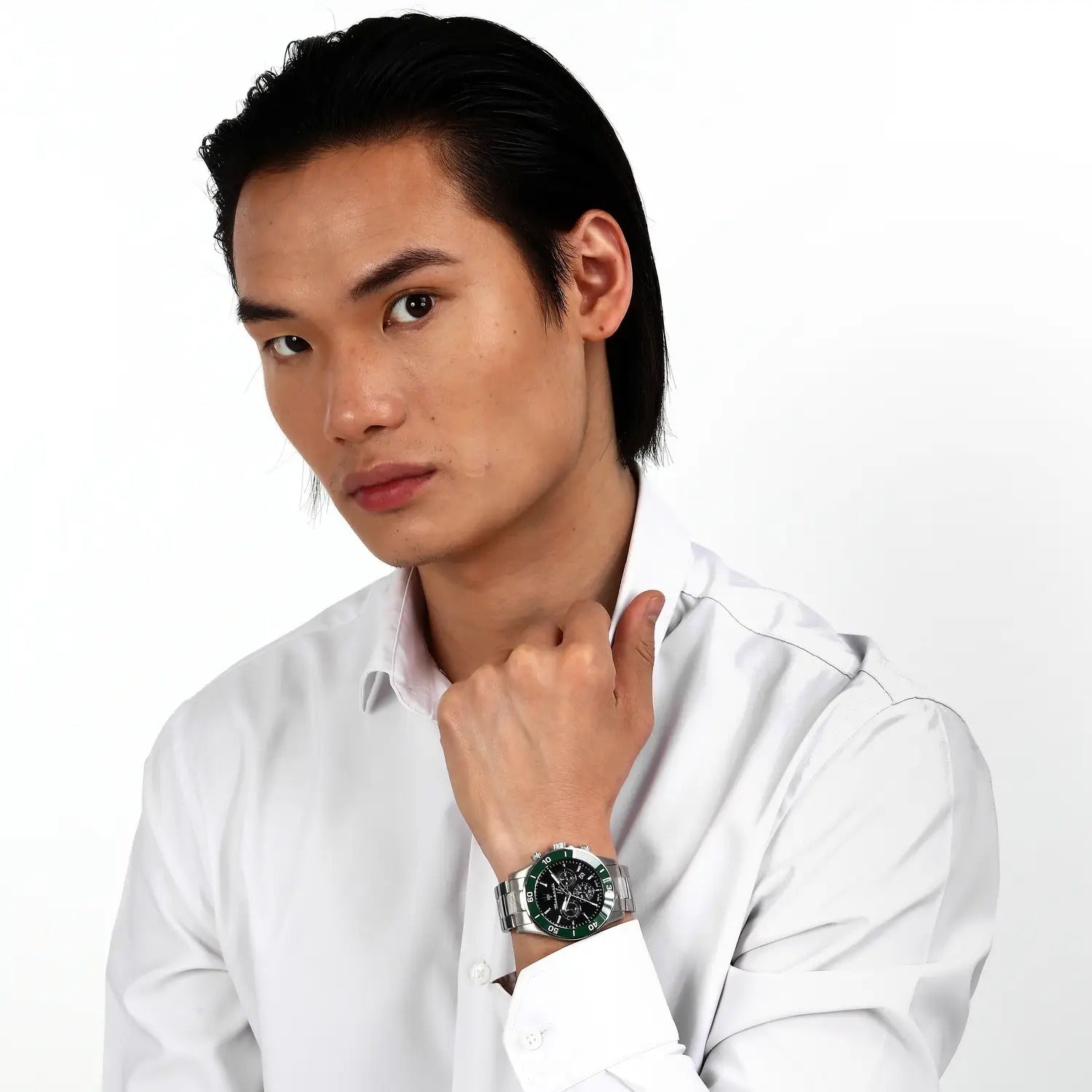 Orologio cronografo da uomo di Maserati della collezione Competizione. Cassa in acciaio del diametro di 43 mm, ghiera zigrinata in ceramica. Bracciale in acciaio. Resistenza all'acqua di a10 atm.