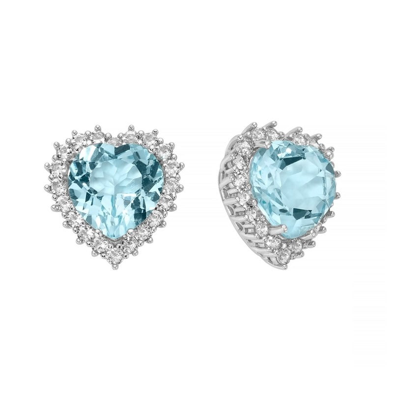 Orecchini a lobo in argento con topazio azzurro di forma cuore, con taglio sfaccettato che ne valorizza la preziosità, contorno di topazi bianchi taglio tondo.