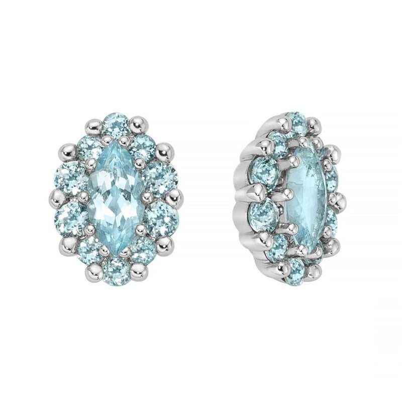 Orecchini a lobo in argento della collezione Gemma del Cielo di Miluna a forma di navette, sono valorizzati al centro da due topazi azzurri naturali naturali taglio navette per una caratura complessiva di 0,69 ct ed impreziositi da un contorno di venti topazi azzurri naturali taglio tondo per una caratura complessiva di 1,12 ct. Chiusura a perno con farfallina.