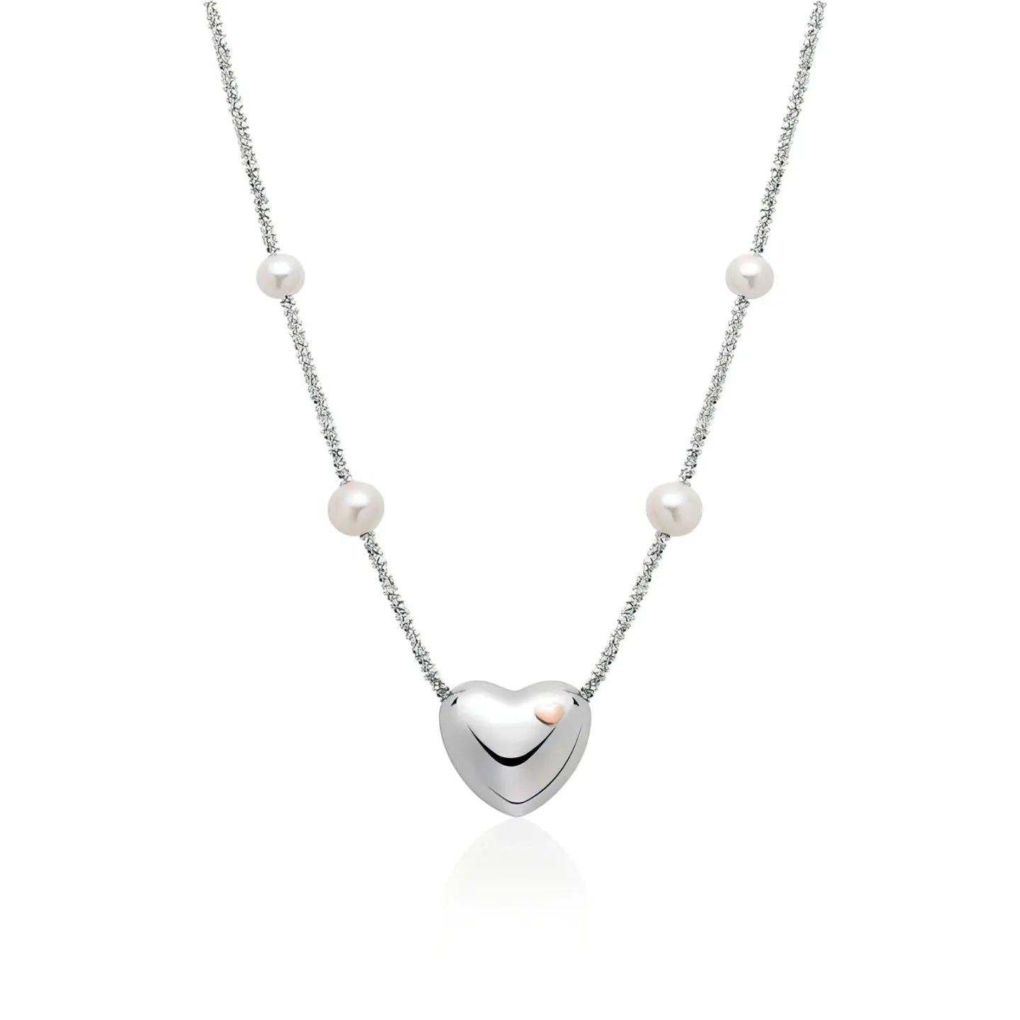 Collana Miluna della collezione Tesori di famiglia realizzata in argento 925 con lavorazione effetto diamantato con 4 perle bianche da 6- 6,5 mm e da 7-7,5 mm di diametro. La collana ha un cuore centrale color argento arricchito da un cuoricino in oro rosato. Lunghezza collana 20 - 22 cm, chiusura a moschettone.