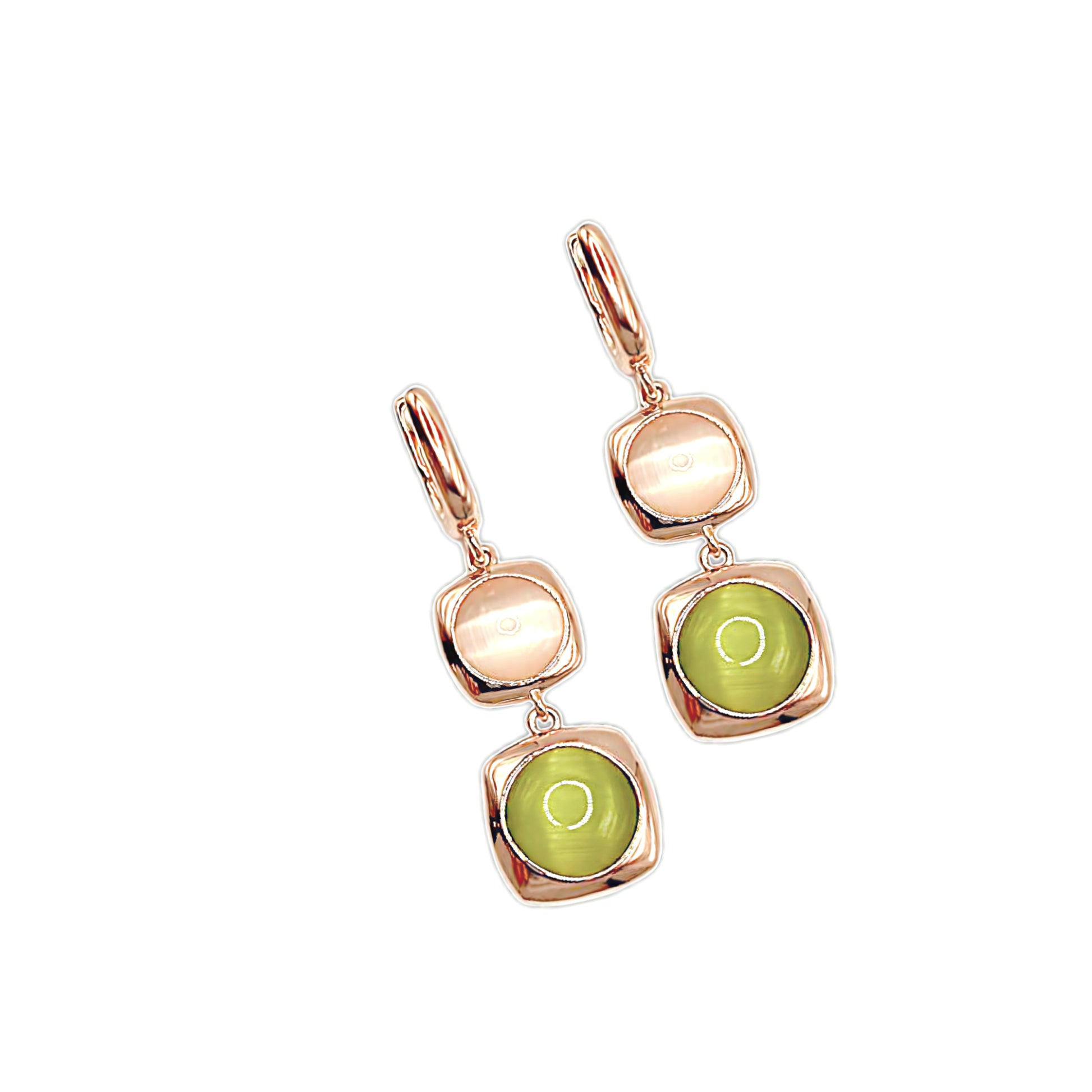 Orecchini pendenti della collezione Oblò di Madì realizzata in argento placcato oro rosa con due pietre di Quarzo idrotermale verde e blu avvolti in una cornice arrotondata . Lunghezza orecchini 5 cm, chiusura a clip.