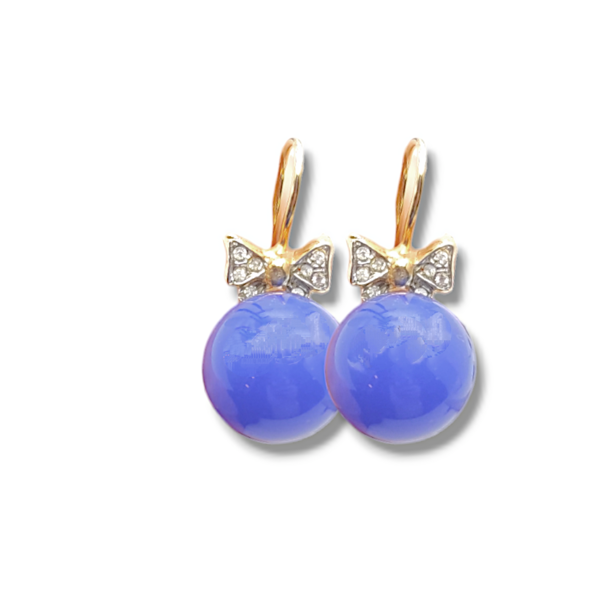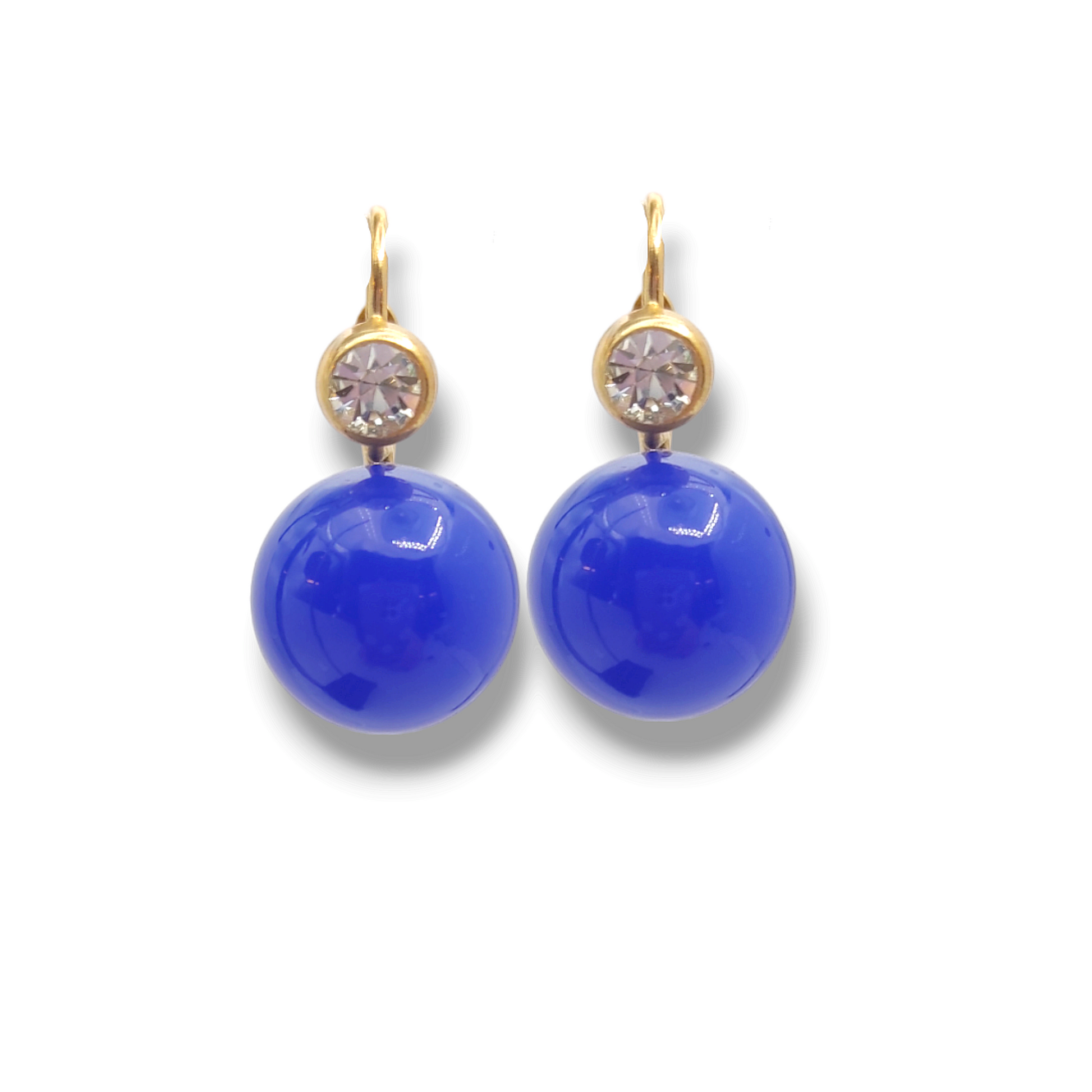 Orecchini realizzati in argento 925 placcato oro impreziositi da zirconi bianchi e una pietra dura di colore blu da 15 mm di diametro. Dimensione orecchini 3,2 cm, chiusura a monachella chiusa
