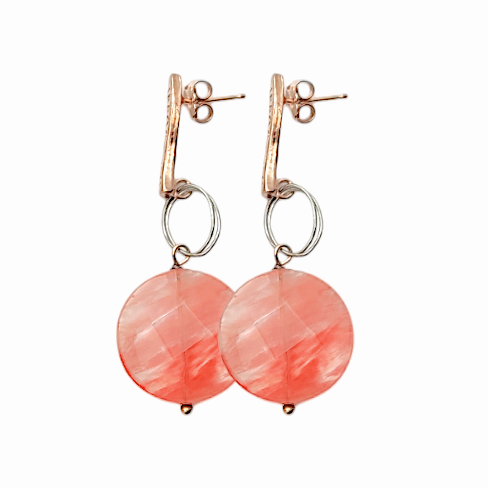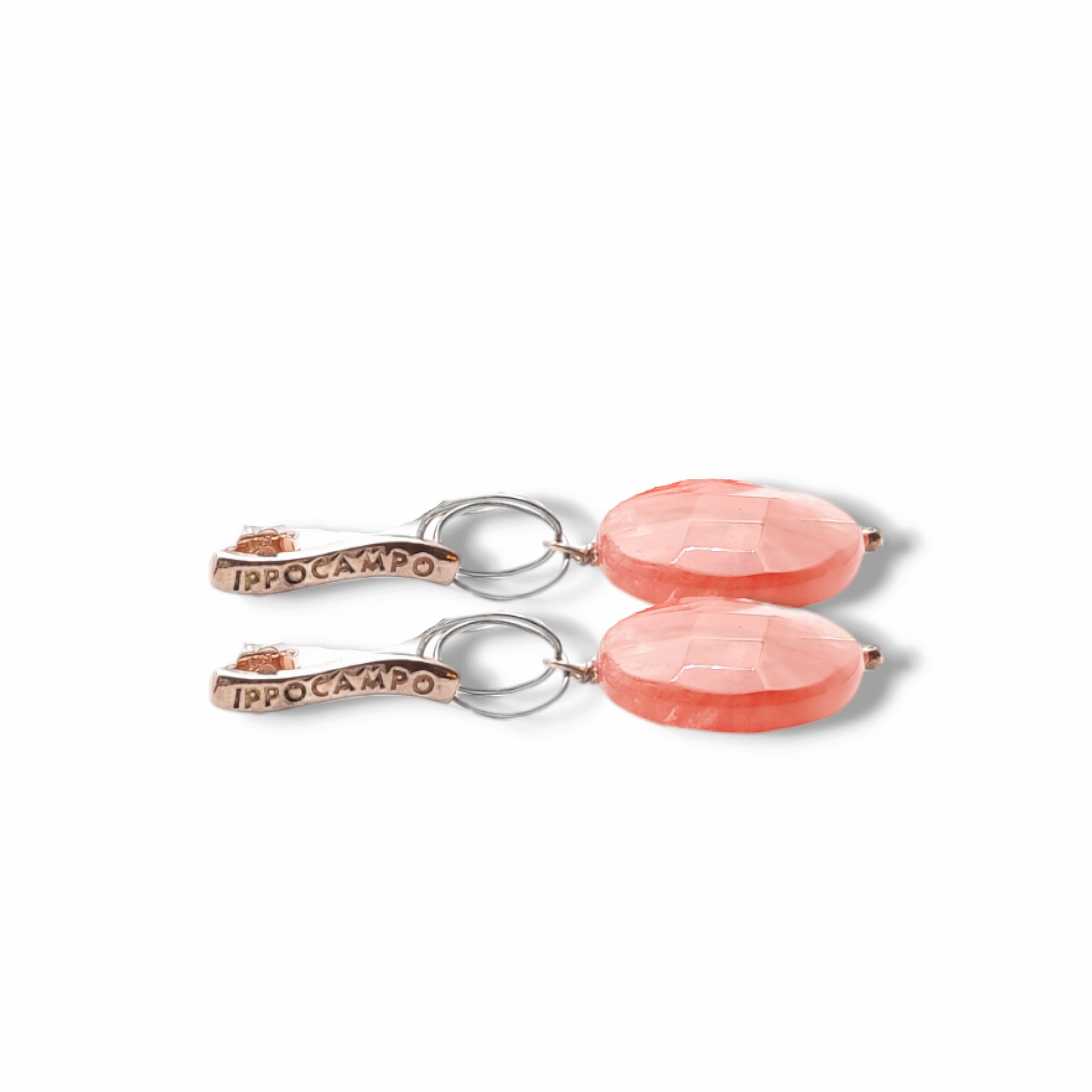 Orecchini pendenti Ippocampo realizzati in argento ramato con pendenti rotondi di pietra dura naturale di colore arancione . Lunghezza orecchini 5 cm, diametro 2 cm, chiusura a farfalla