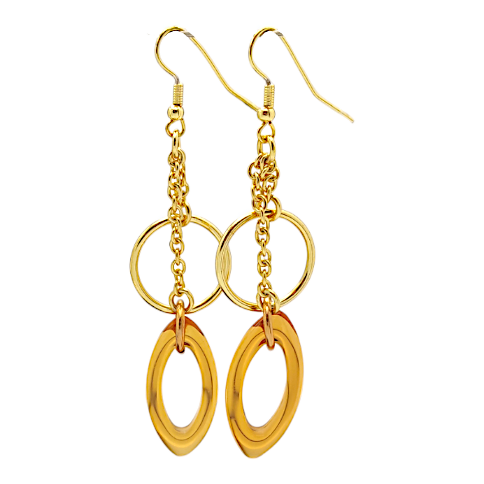 Orecchini pendenti a cerchi Unoaerre realizzati in acciaio placcato oro giallo con pendente ovale in resina colore marrone. Lunghezza orecchini cm,
