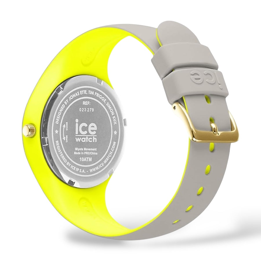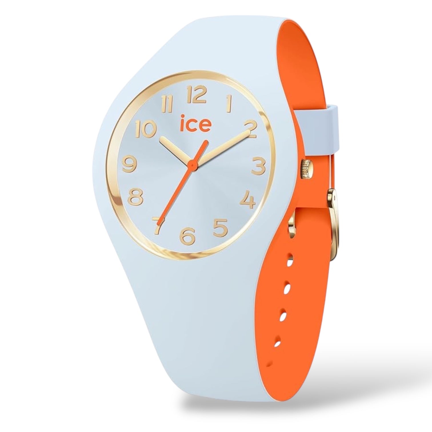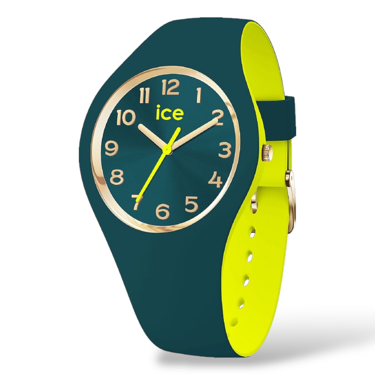 Orologio solo tempo da donna o bambini di Ice Watch della collezione Ice Duo Chic, cassa in plastica con fondello in acciaio, dimensione cassa 34 mm, quadrante colorato con numeri e sfere oro. Cinturino in morbico silicone tutt'uno con la cassa, chiusura fibbia. Resistenza all'acqua di 10 Atm. Movimento solo tempo al quarzo.