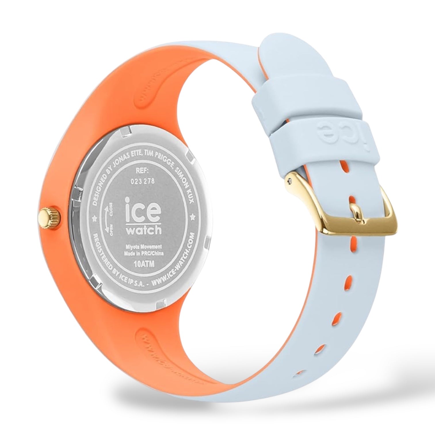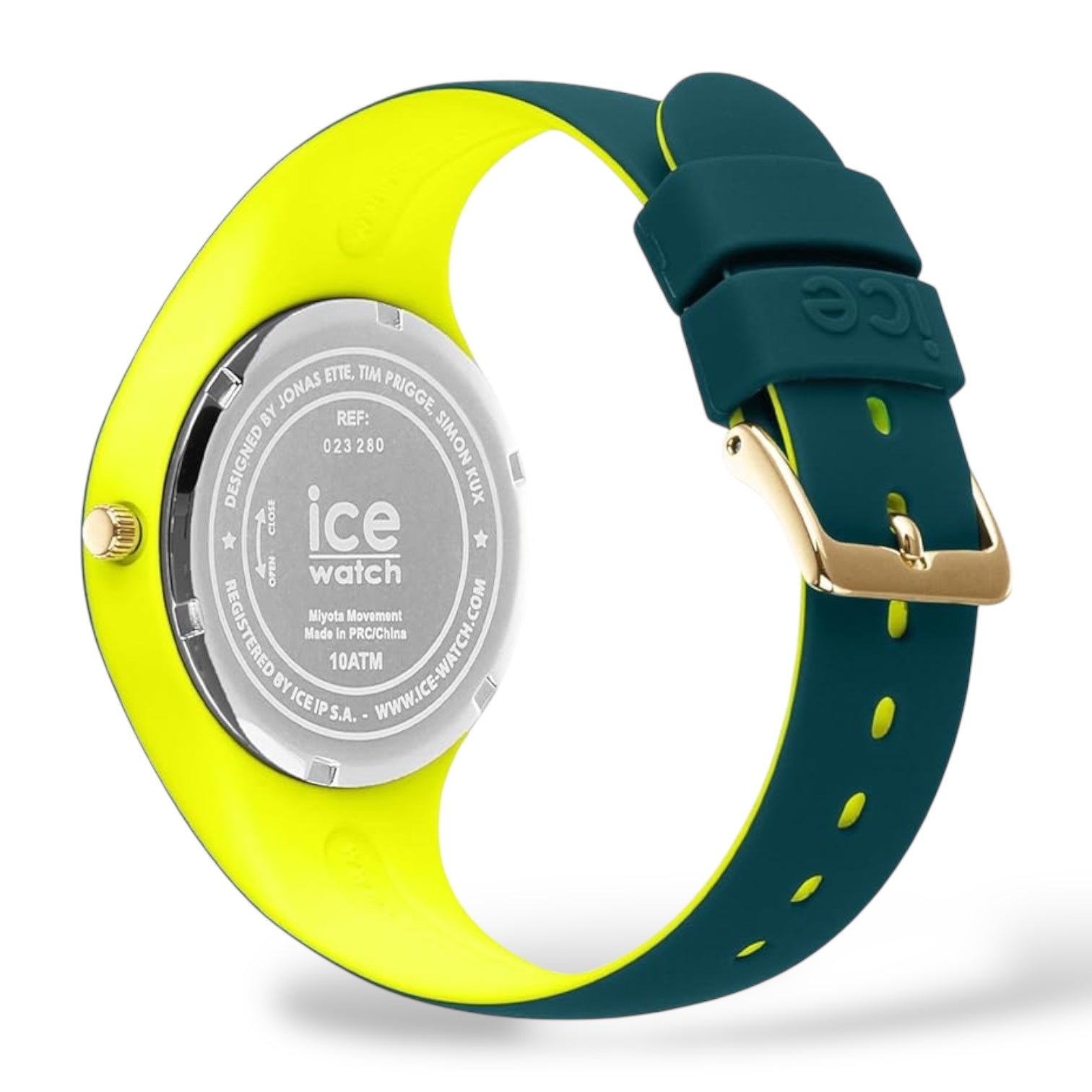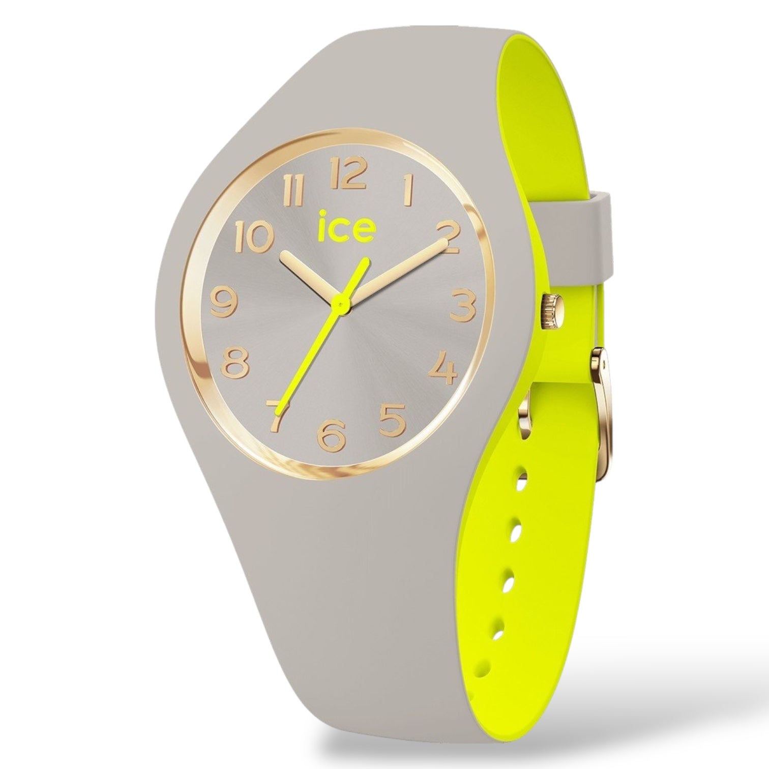 Orologio solo tempo da donna o bambini di Ice Watch della collezione Ice Duo Chic, cassa in plastica con fondello in acciaio, dimensione cassa 34 mm, quadrante colorato con numeri e sfere oro. Cinturino in morbico silicone tutt'uno con la cassa, chiusura fibbia. Resistenza all'acqua di 10 Atm. Movimento solo tempo al quarzo.
