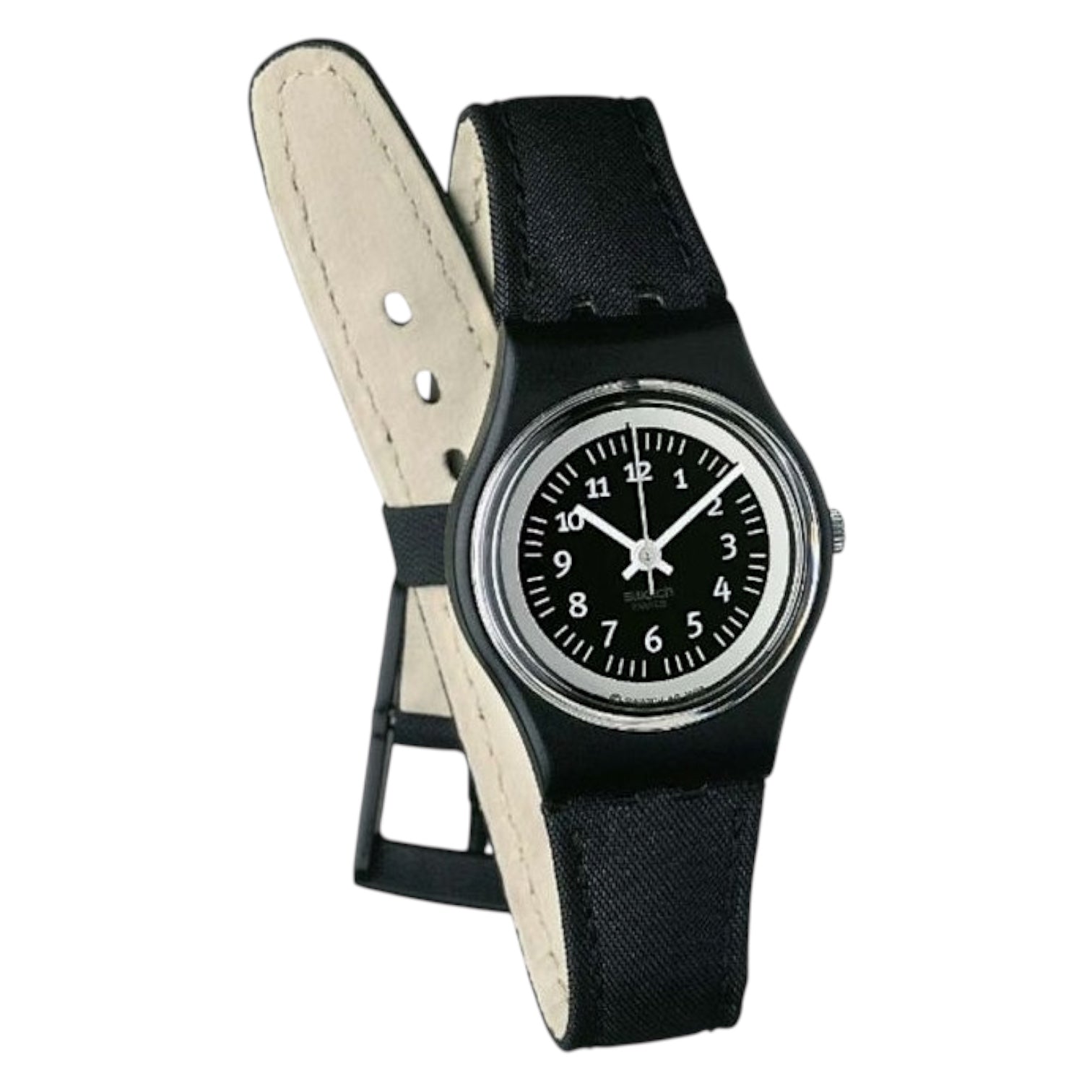 Orologio solo tempo donna o bambini di Swatch Lady Noche Blanca. Cassa in plastica nera del diametro di 25 mm, quadrante nero con indici e numeri bianchi e contorno silver, sfere bianche, cinturino in tessuto nero, chiusura fibbia in plastica. Resistenza all'acqua 3 atm. Movimento al quarzo Swiss Made.