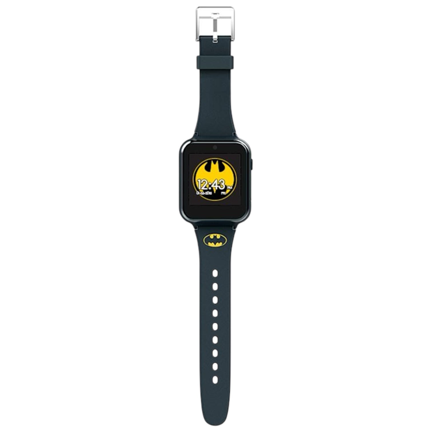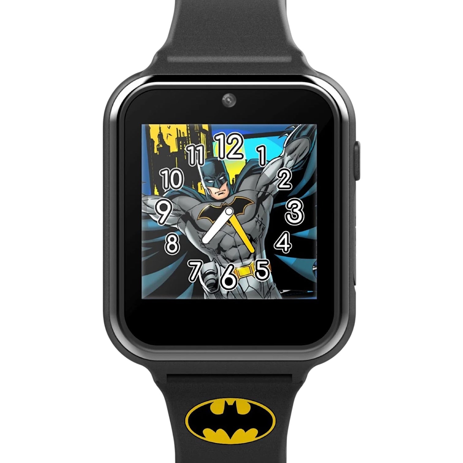 Orologio interattivo digitale touch screen da bambini di Batman. Cassa in plastica nera delle dimensioni di 45 x 40 mm, quadrante digitale a sette segmenti, si attiva premendo il pulsante laterale, ha funzioni di fotocamera, registrazione video, album, registrazione vocale, timer, calcolatrice, contapassi, allarme, scelta quadrante e giochi; cinturino in silicone nero con simbolo gialla di Batman, chiusura fibbia in acciaio. Non è resistente all'acqua. Movimento digitale multifunzione al quarzo.
