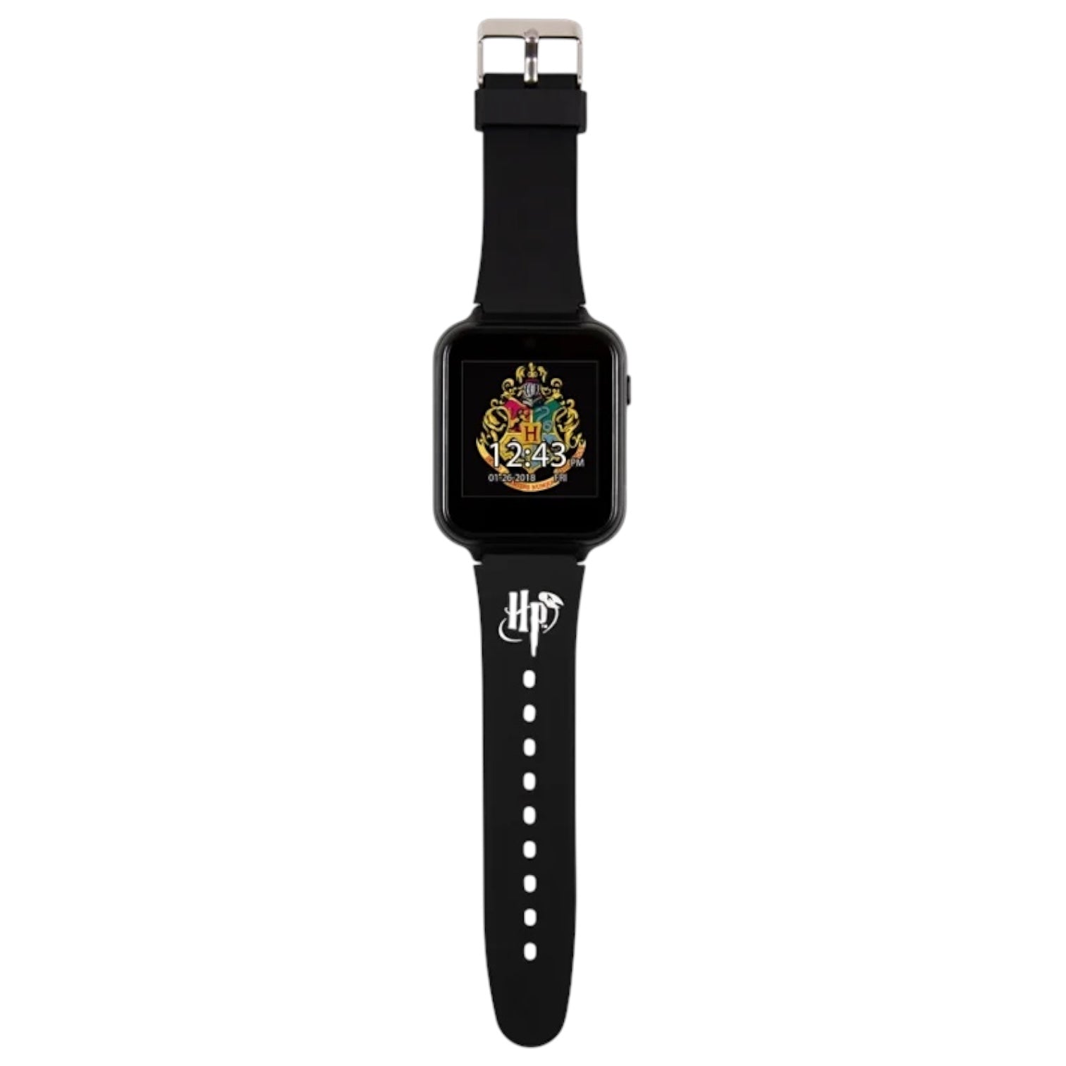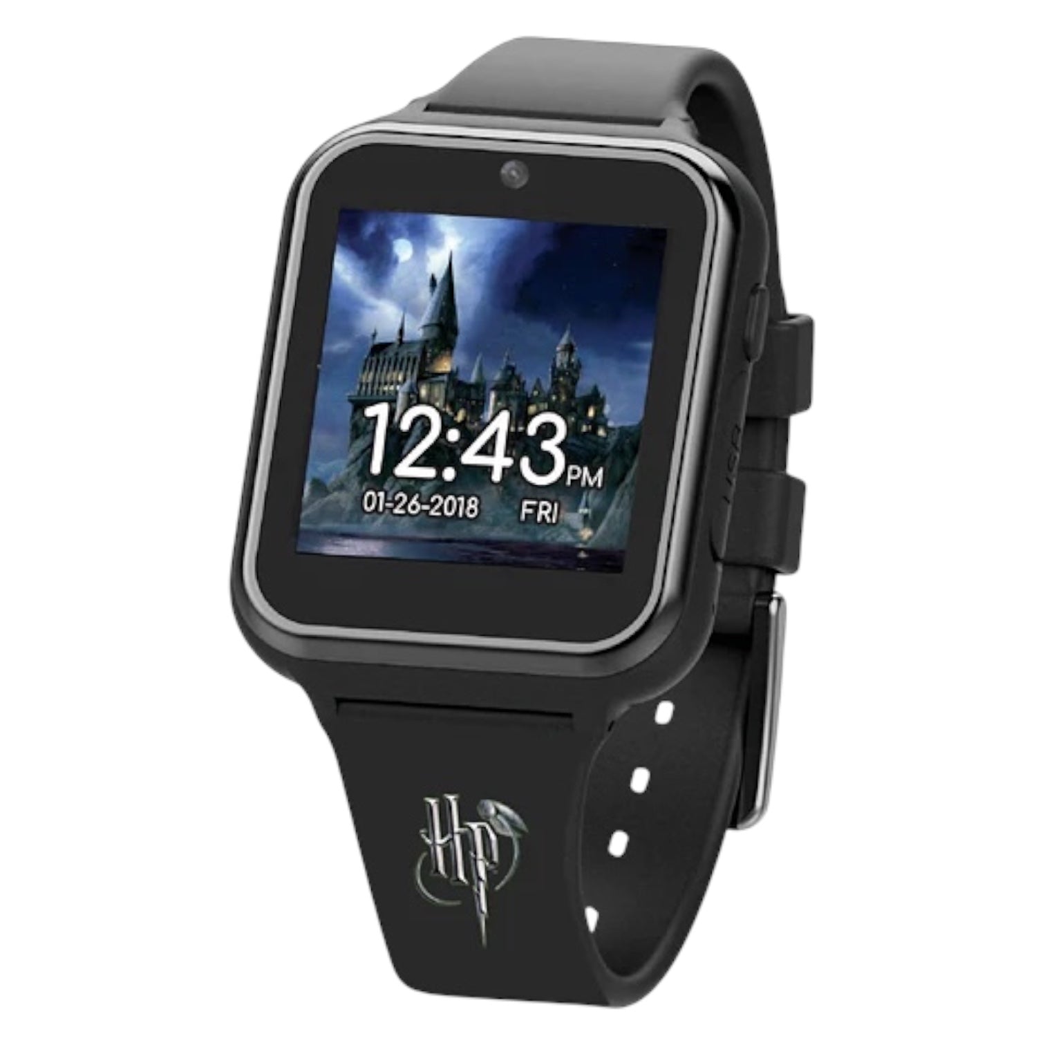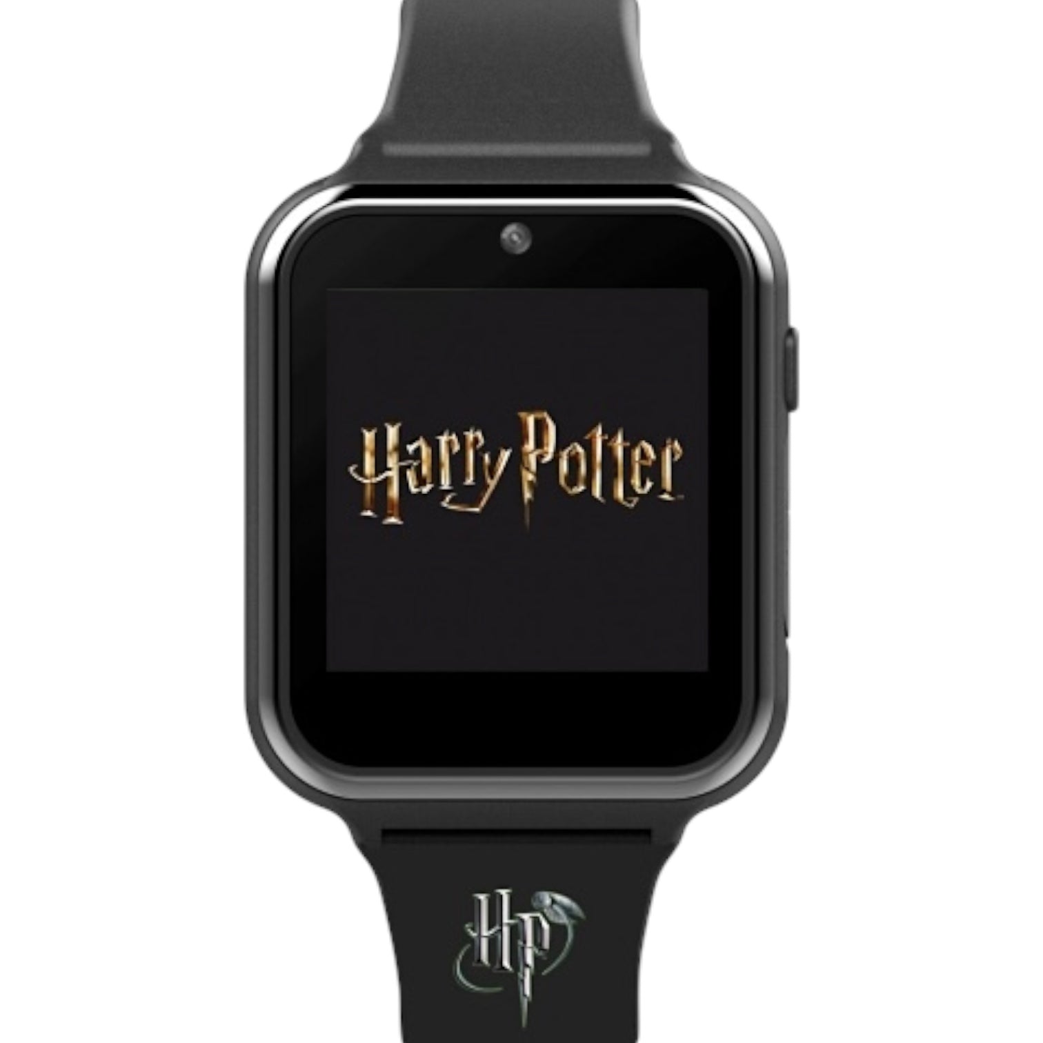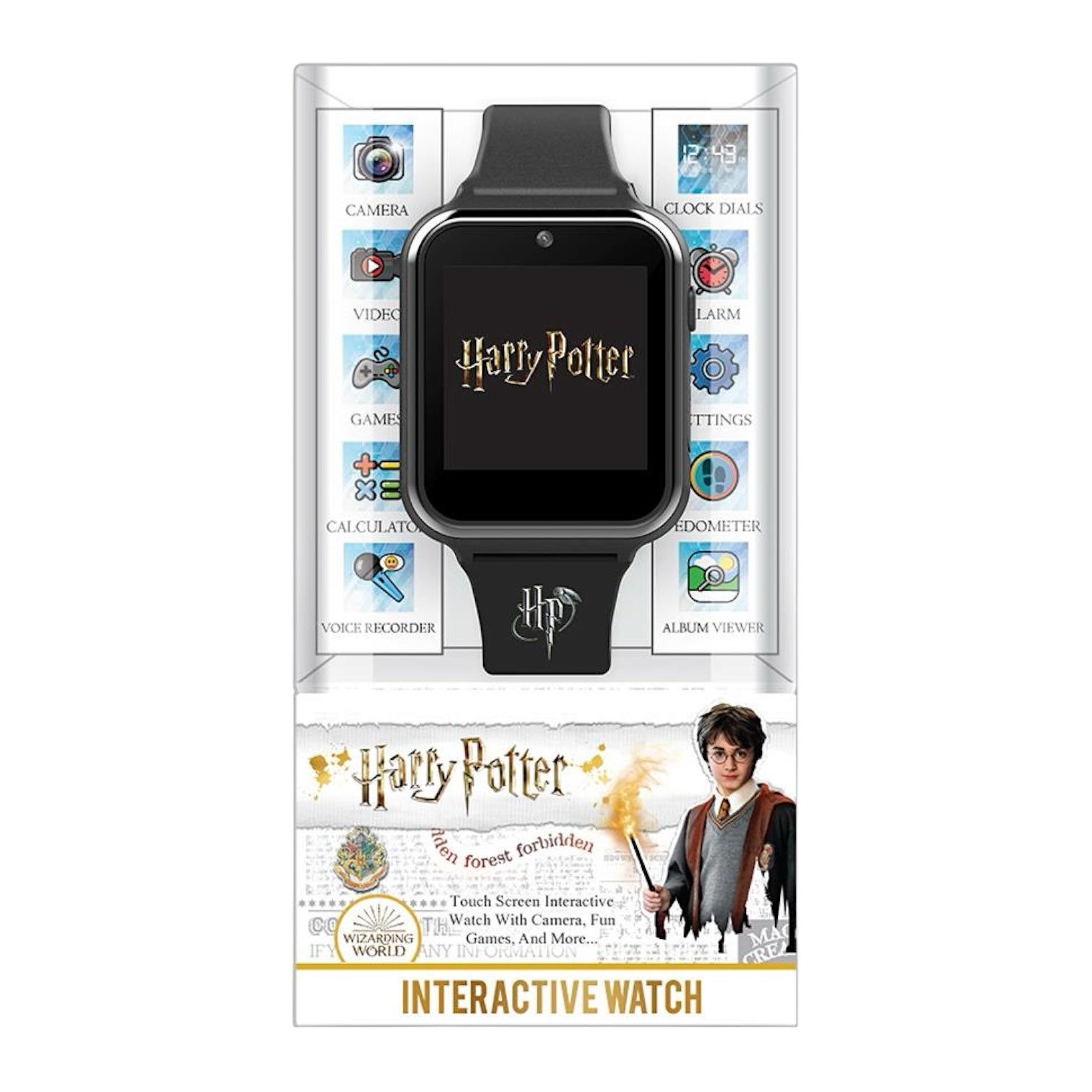 Orologio interattivo digitale touch screen da bambini di Harry Potter. Cassa in plastica nera delle dimensioni di 45 x 40 mm, quadrante digitale a sette segmenti, si attiva premendo il pulsante laterale, ha funzioni di fotocamera, registrazione video, album, registrazione vocale, timer, calcolatrice, contapassi, allarme, scelta quadrante e giochi; cinturino in silicone nero, chiusura fibbia in acciaio. Non è resistente all'acqua. Movimento digitale multifunzione al quarzo.