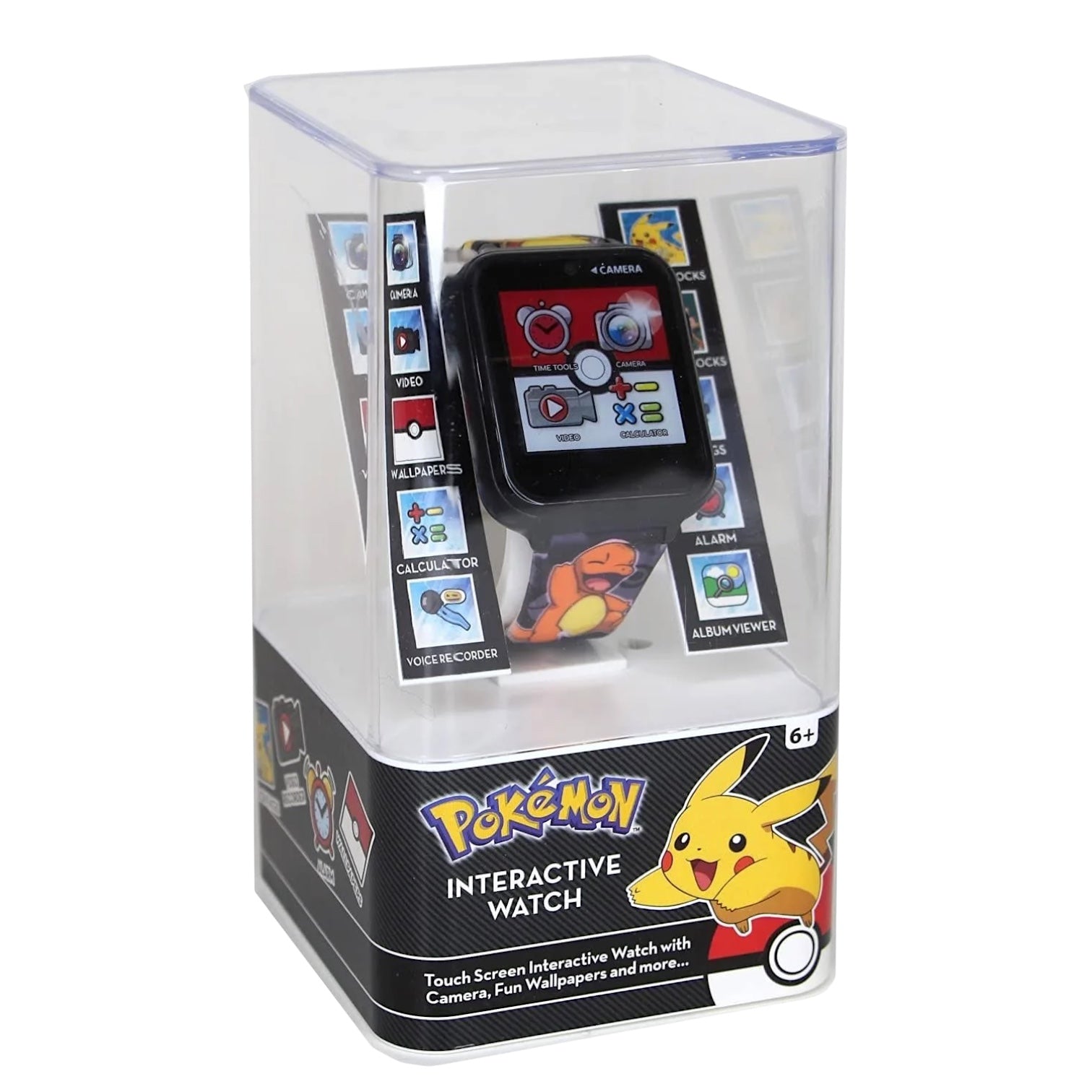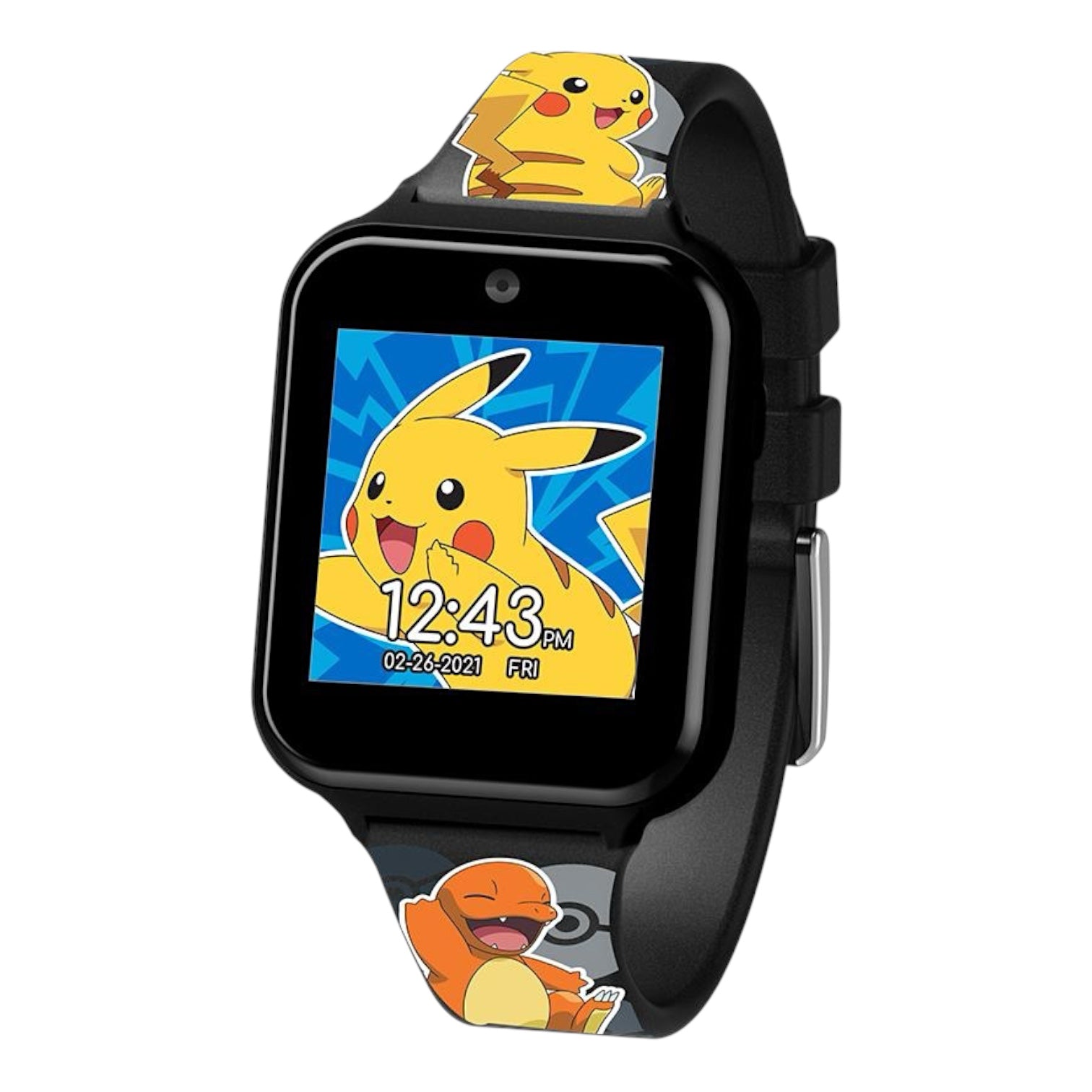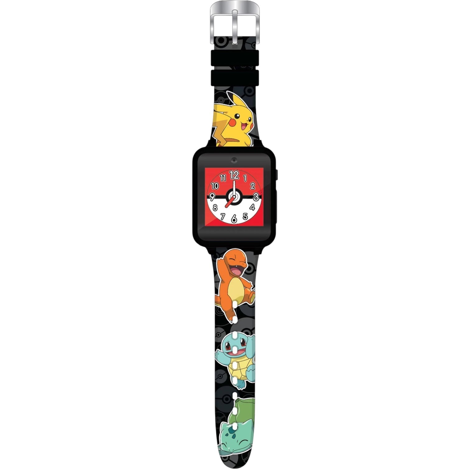 Orologio interattivo digitale touch screen da bambini di Pokémon. Cassa in plastica nera delle dimensioni di 45 x 40 mm, quadrante digitale a sette segmenti, si attiva premendo il pulsante laterale, ha funzioni di fotocamera, registrazione video, album, registrazione vocale, timer, calcolatrice, contapassi, allarme, scelta quadrante e giochi; cinturino in silicone base nera con personaggi di Pokémon, chiusura fibbia in acciaio. Non è resistente all'acqua. Movimento digitale multifunzione al quarzo.