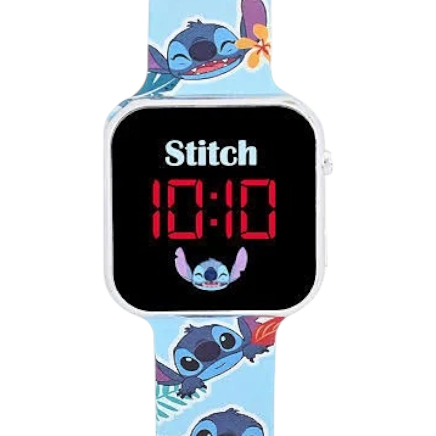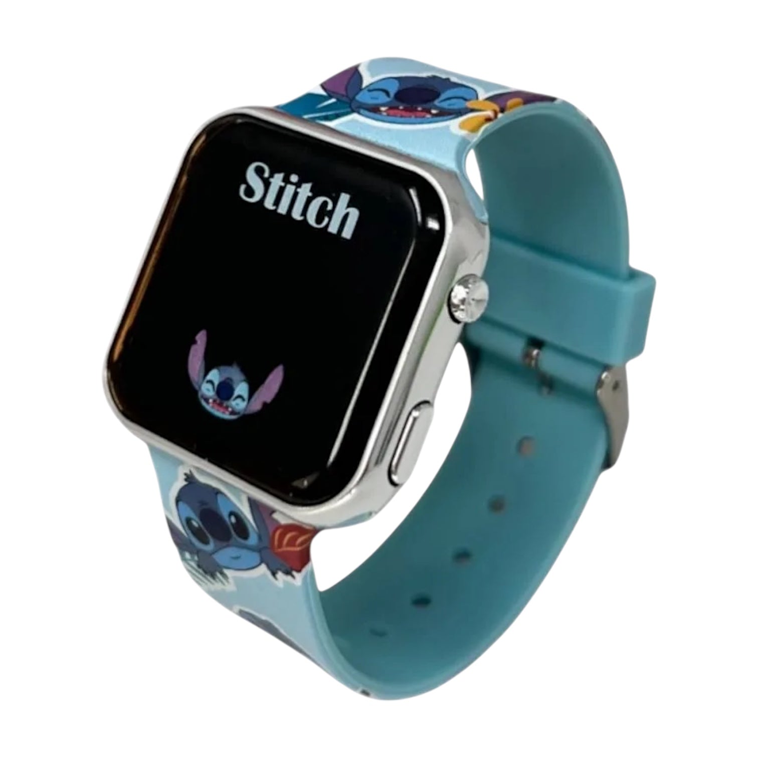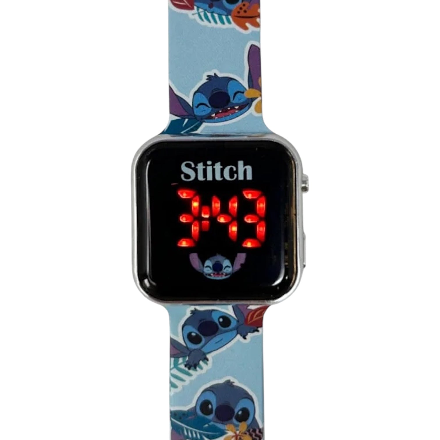 Orologio Led da bambini di Disney Stitch. Cassa in plastica silver delle dimensioni di 35 x 35 mm, quadrante digitale a sette segmenti, si attiva premendo il pulsante laterale, cinturino in silicone base azzurra con Stitch, chiusura fibbia in acciaio. Non è resistente all'acqua. Movimento digitale al quarzo.