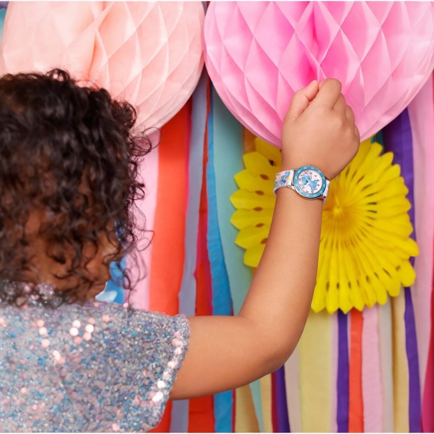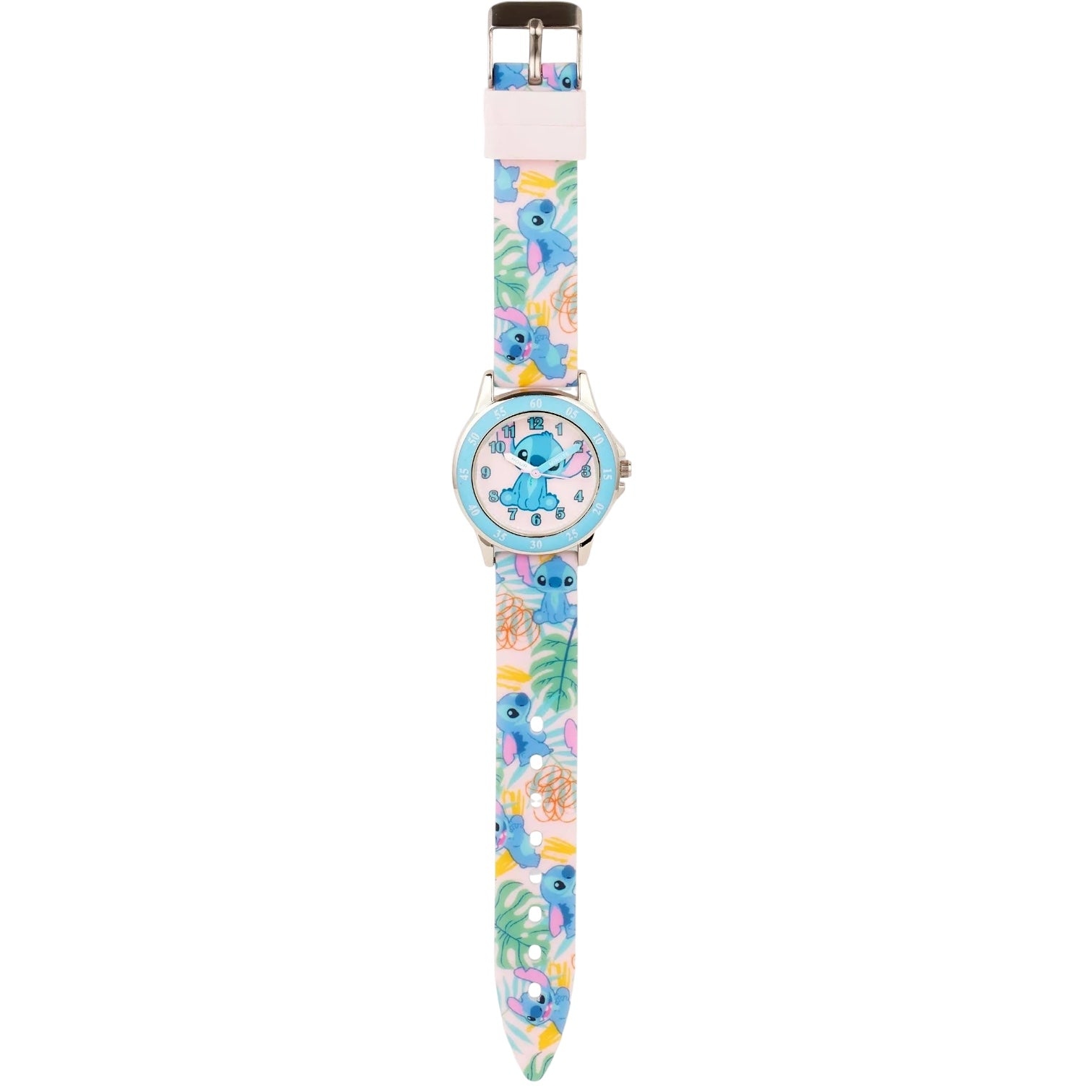 Orologio solo tempo in acciaio da bambini di Disney ideato per insegnare a leggere l'orario, Stitch. Cassa in acciaio del diametro di 33 mm, lunetta azzurra con minuteria, quadrante rosa con Stitch, indici bianchi e numeri azzurri, sfere bianca e azzurra, cinturino in silicone con Stitch, chiusura fibbia in acciaio. Non è resistente all'acqua. Movimento solo tempo al quarzo.