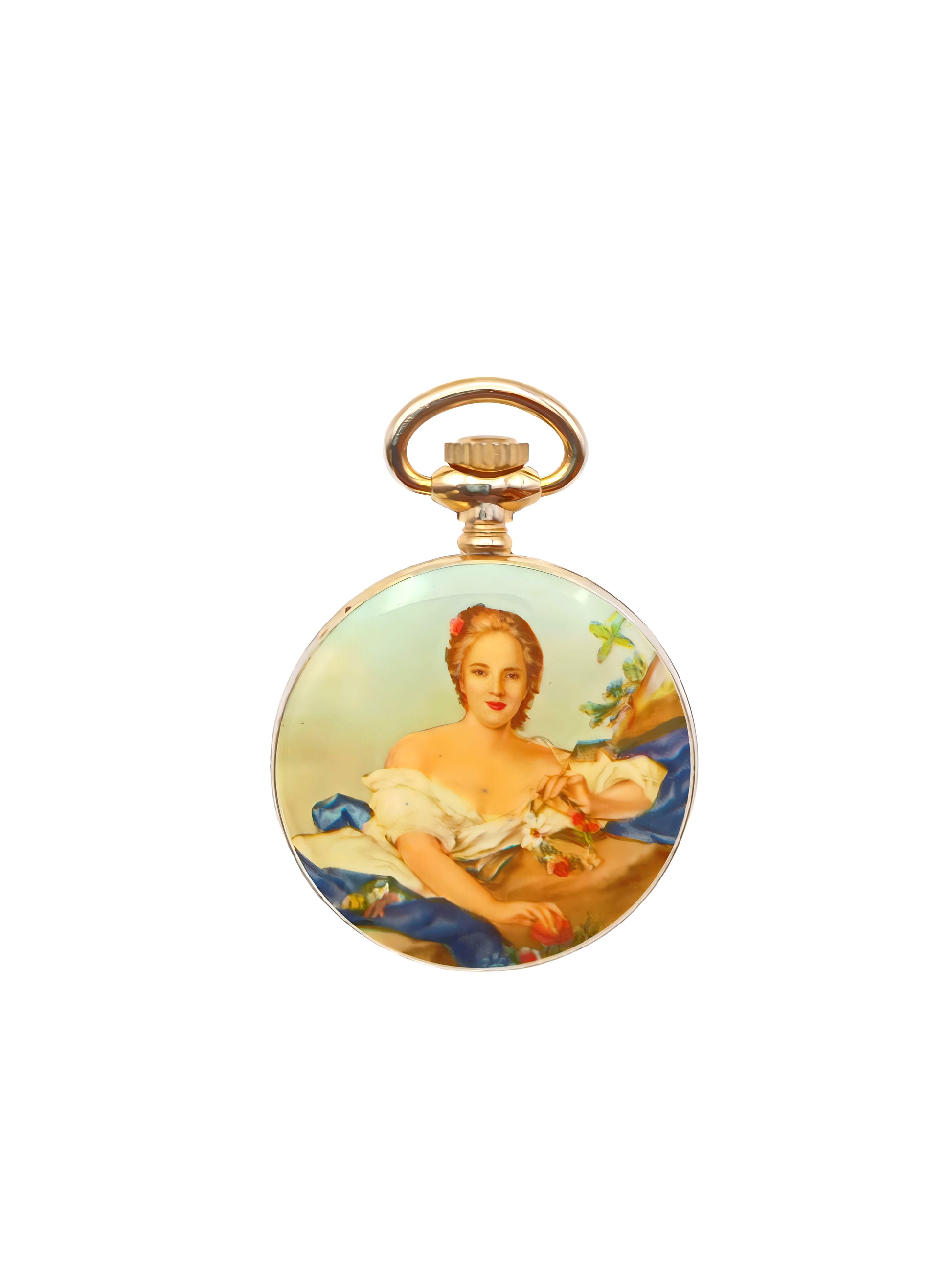 Orologio da catena stile vintage realizzato con cassa in acciaio inox dorato dal diametro di 29 mm. Quadrante bianco con numeri romani neri e lancette nere, elementi di colore oro e fondello decorato. Movimento con carica manuale azionabile tramite la corona posta in alto.