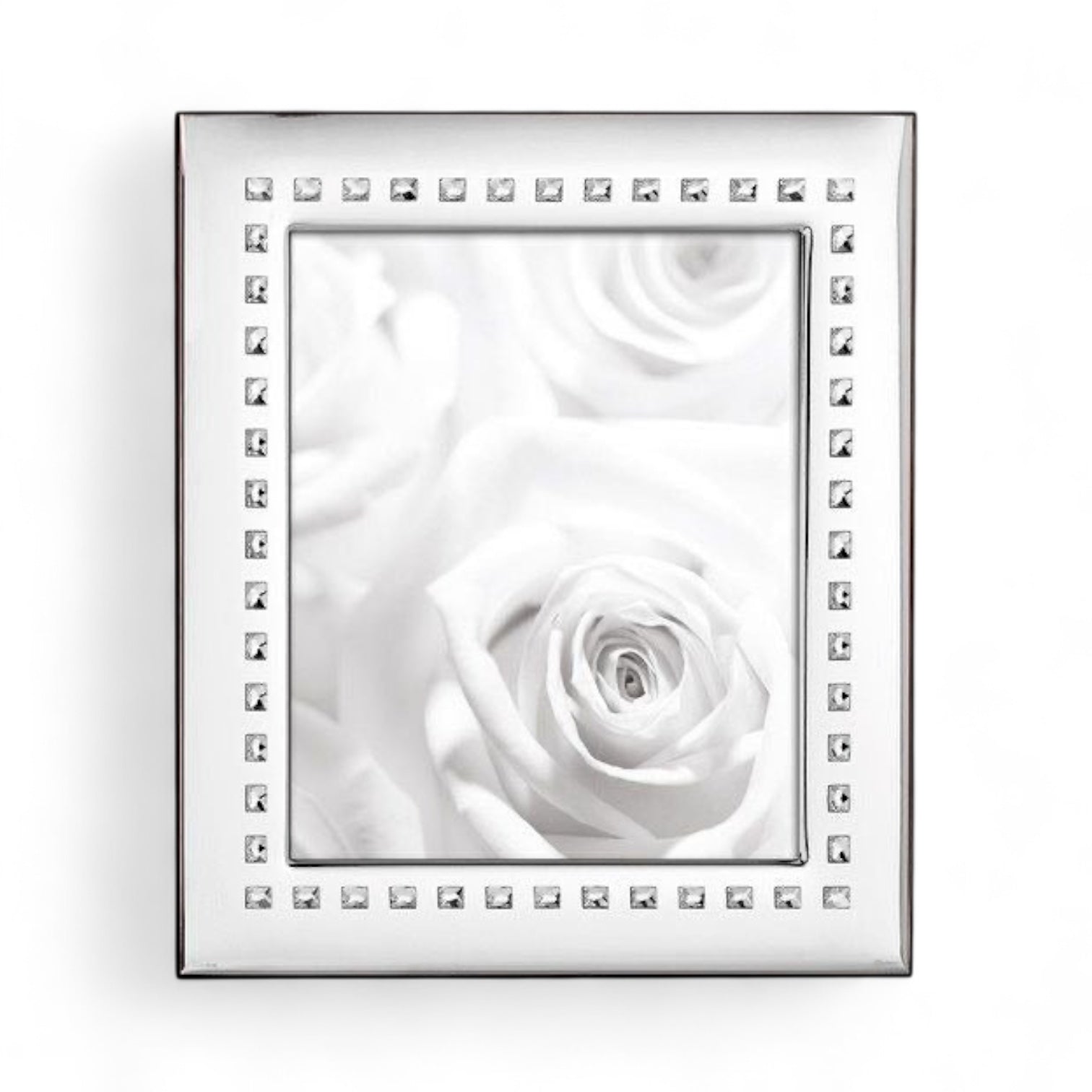 Cornice portafoto in argento di Ottaviani della collezione Chic. Cornice realizzata con lastra argento e cristalli Swarovski applicati, retro in legno scuro.