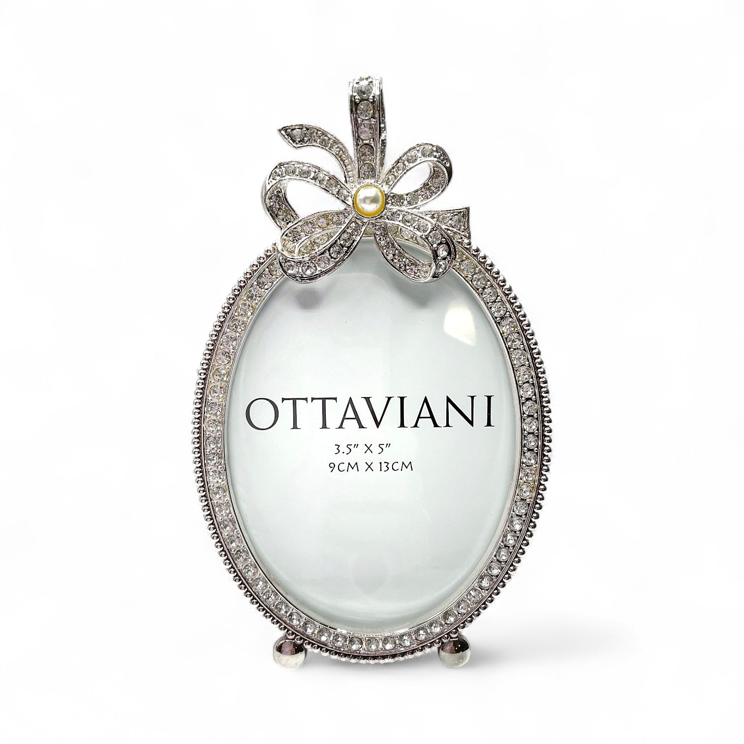 Cornice portafoto ovale in metallo di Ottaviani. Cornice ovale realizzata in metallo con cristalli Swarovski applicati, retro in velluto nero.
