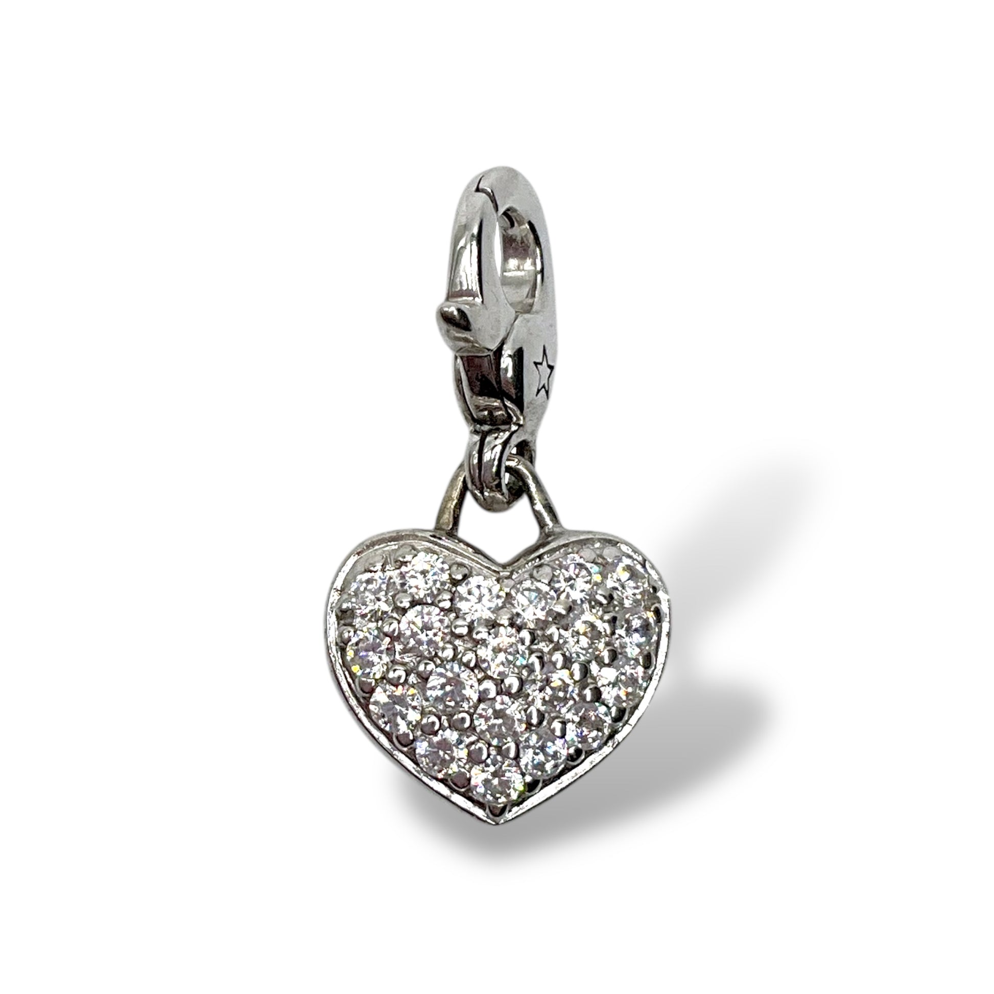 Ciondolo della collezione Charming by Ti sento in argento a forma di cuore con zirconi. Questo ciondolo ha un comodo moschettone per poterlo inserire in bracciali o collane.