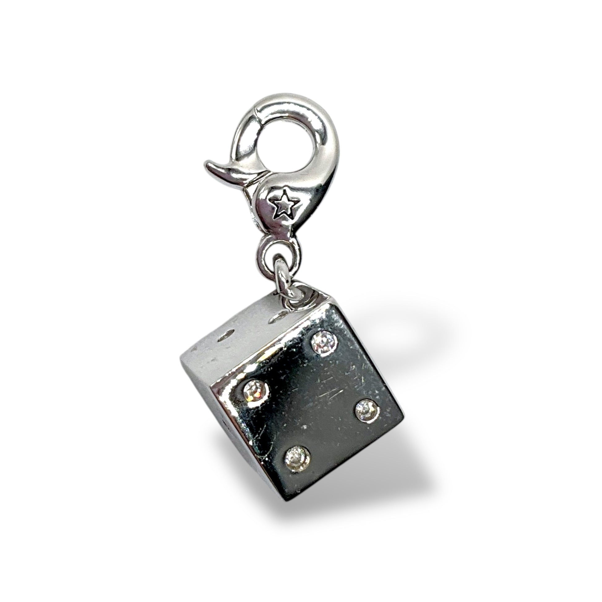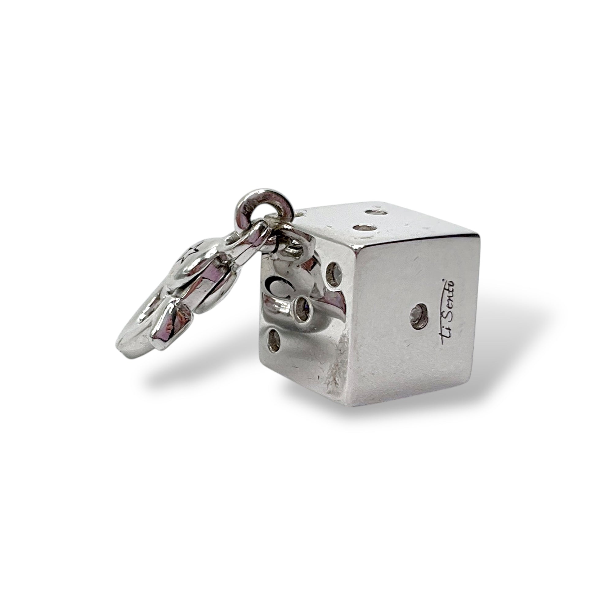 Ciondolo della collezione Charming by Ti sento in argento a forma di dado con cristalli al posto dei numeri. Questo ciondolo ha un comodo moschettone per poterlo inserire in bracciali o collane.