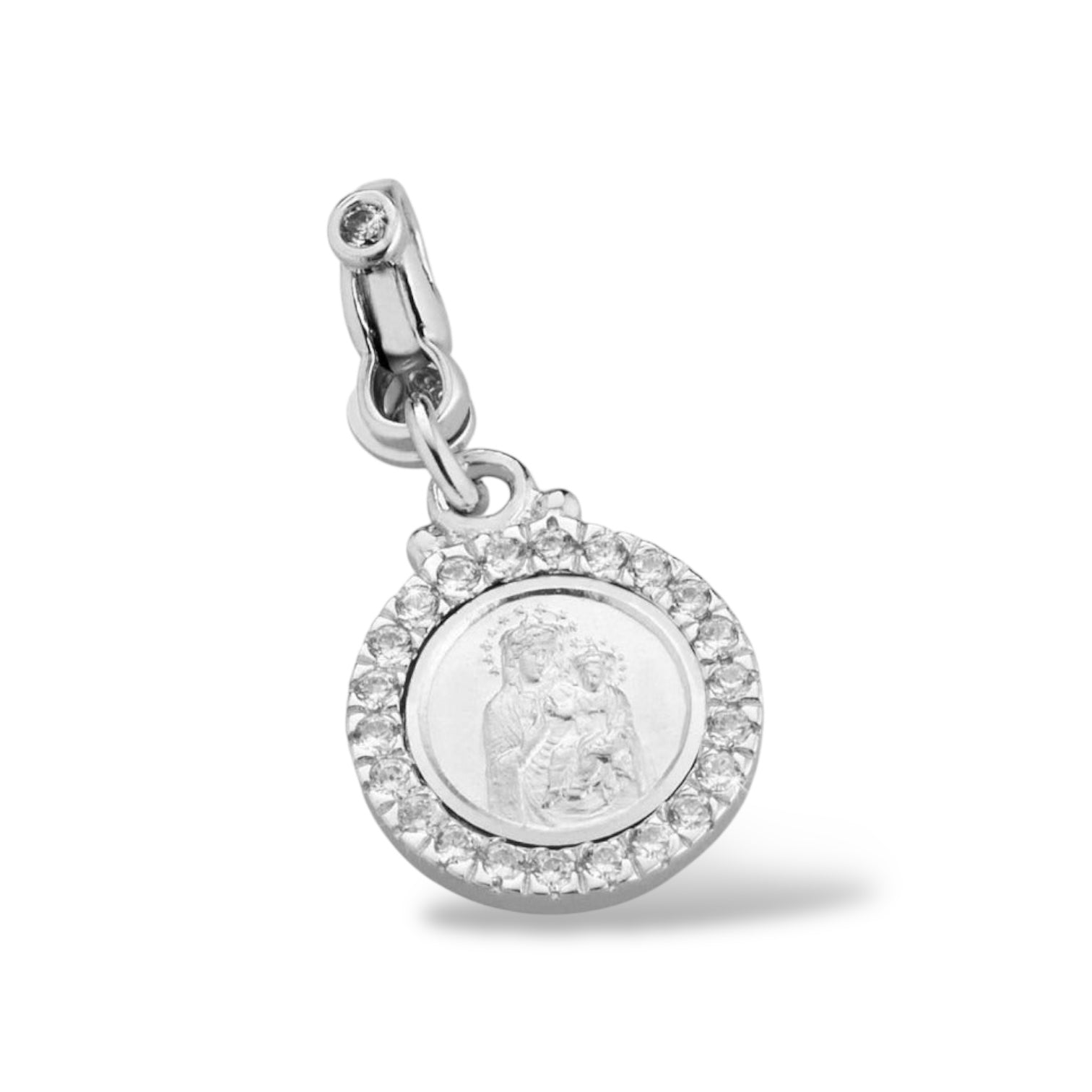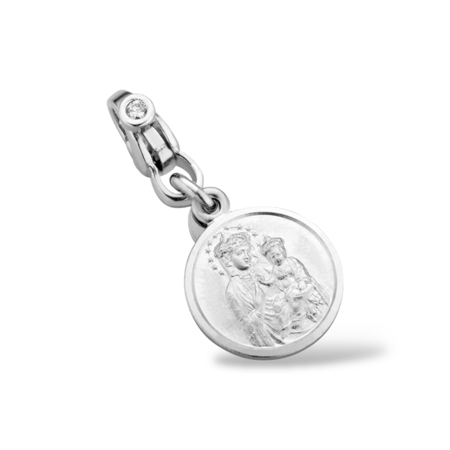 Ciondolo medaglia tonda con Madonna Consolata, comodo moschettone con cristallo ad impreziosire per poterla inserire dove si preferisce, disponibile anche con contorno con zirconi.