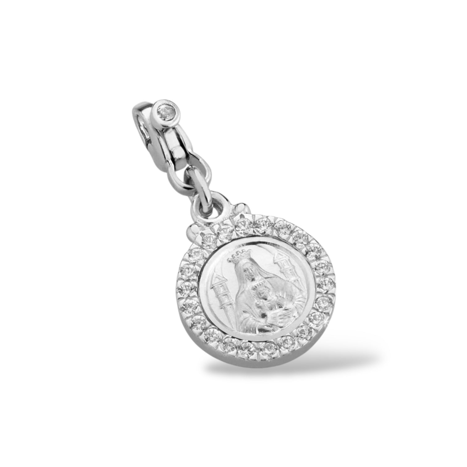 Ciondolo medaglia tonda con Madonna di Coromoto, comodo moschettone con cristallo ad impreziosire per poterla inserire dove si preferisce, contorno di zirconi.