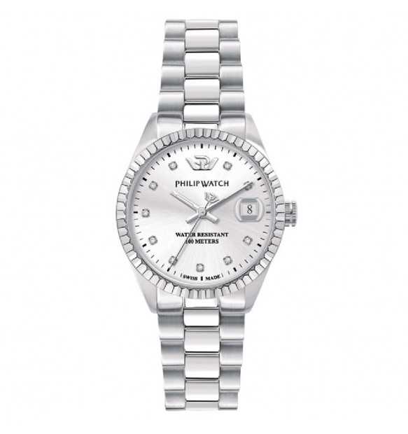 Orologio da donna della collezione Caribe realizzato con cinturino in acciaio inox con chiusura a deployante. Cassa rotonda da 31 mm di diametro con ghiera zigrinata. Quadrante silver con lancette in acciaio inox lucide , indici realizzati con 12 diamanti e datario con lente d'ingrandimento
