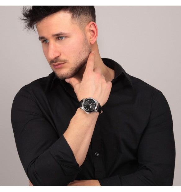 Orologio solo tempo al quarzo della collezione Amalfi realizzato con cinturino in pelle nera con chiusura a deployante. Cassa rotonda in acciaio inox da 43 mm, quadrante nero con lancette e indici in acciaio inox e bianco. Datario alle ore 6, resistenza all'acqua fino a 10 ATM