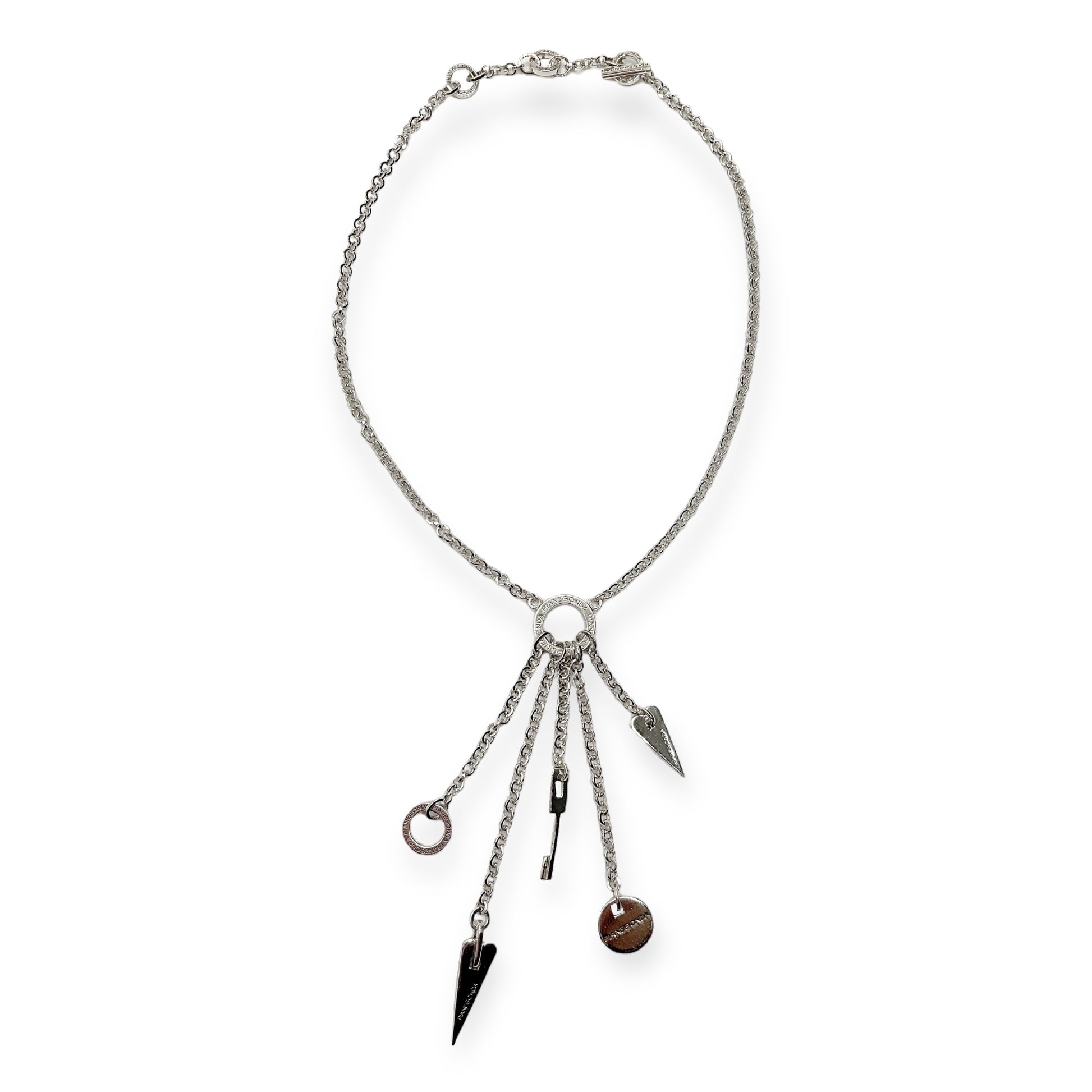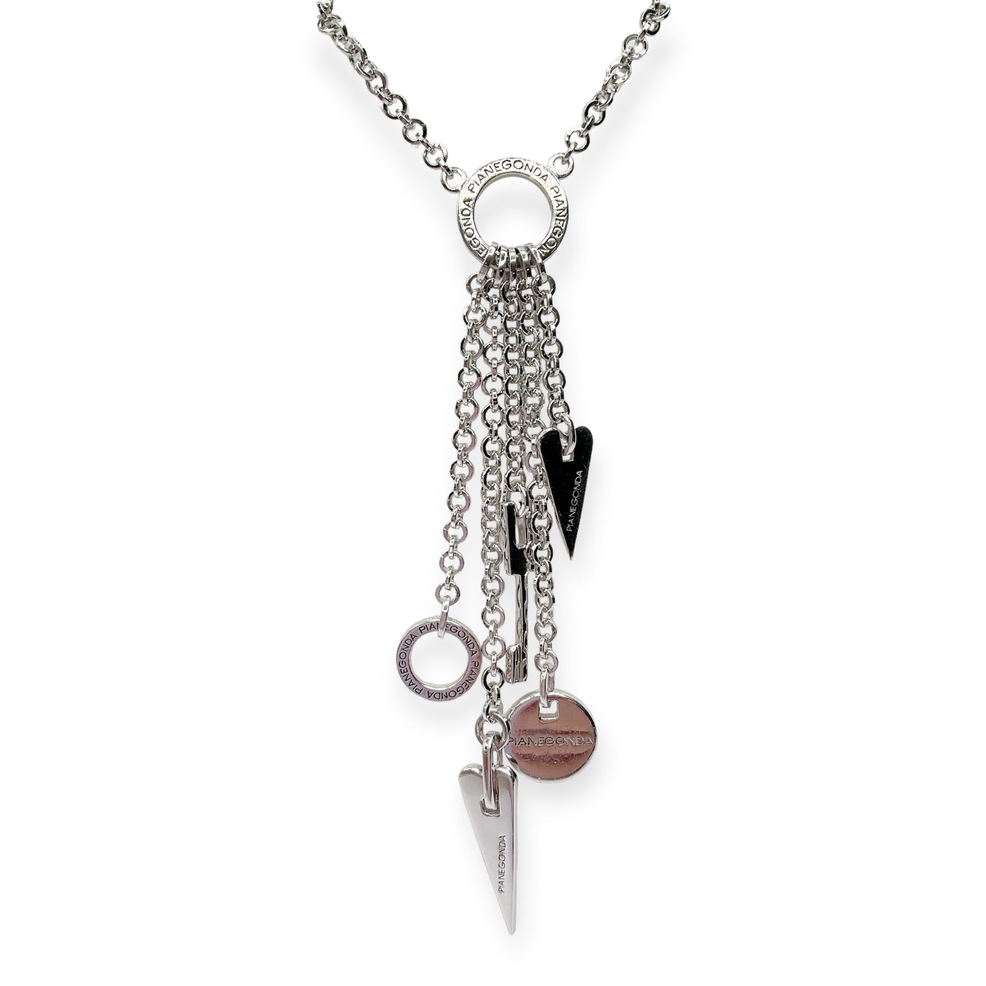 Collana da donna in argento della collezione Confusion. Catena a maglie rotonde con 3 diverse misure di lunghezza, centrale ad anello da cui partono catene di diverse lunghezze con ciondoli di forma diversa.