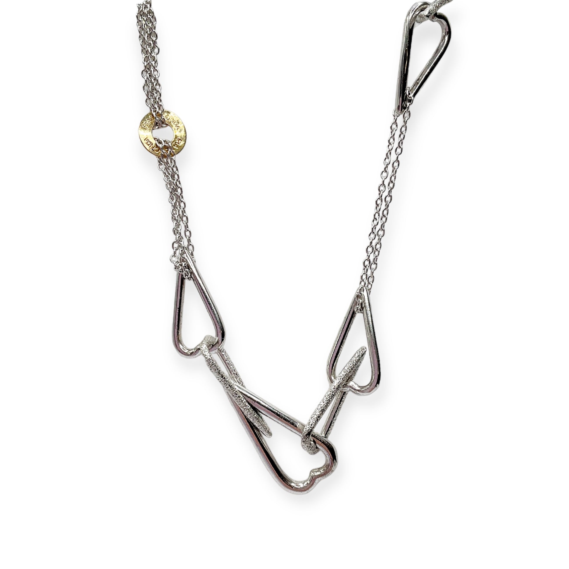 Collana da donna in argento e oro della collezione Love. Girocollo composto da catene rollò doppie intervallate da cuori lisci o sabbiati che donano luce e un cerchio in oro.