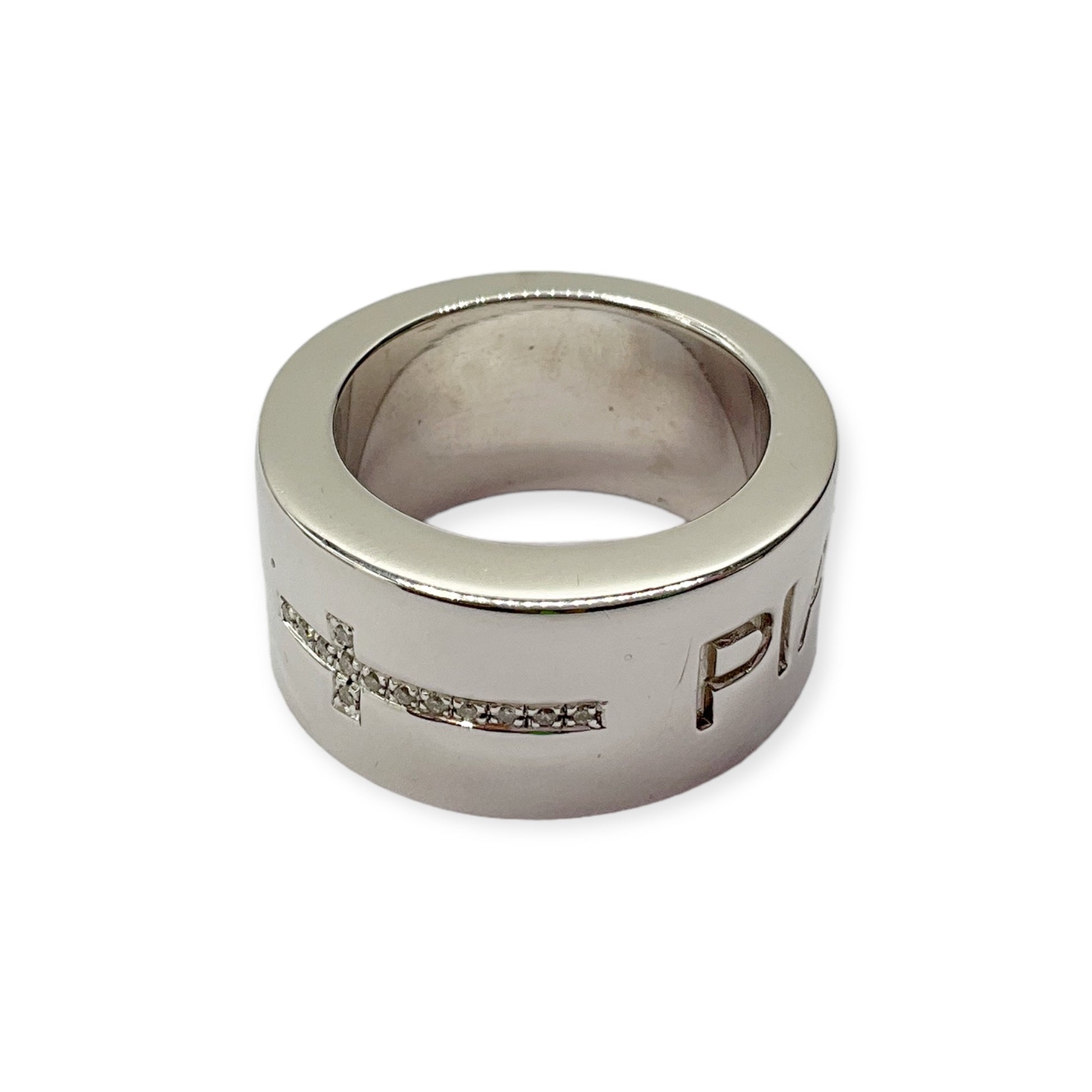 Anello a fascia da Donna in argento. Anello a fascia liscio con logo inciso e croce con brillanti alto 1,1 cm.