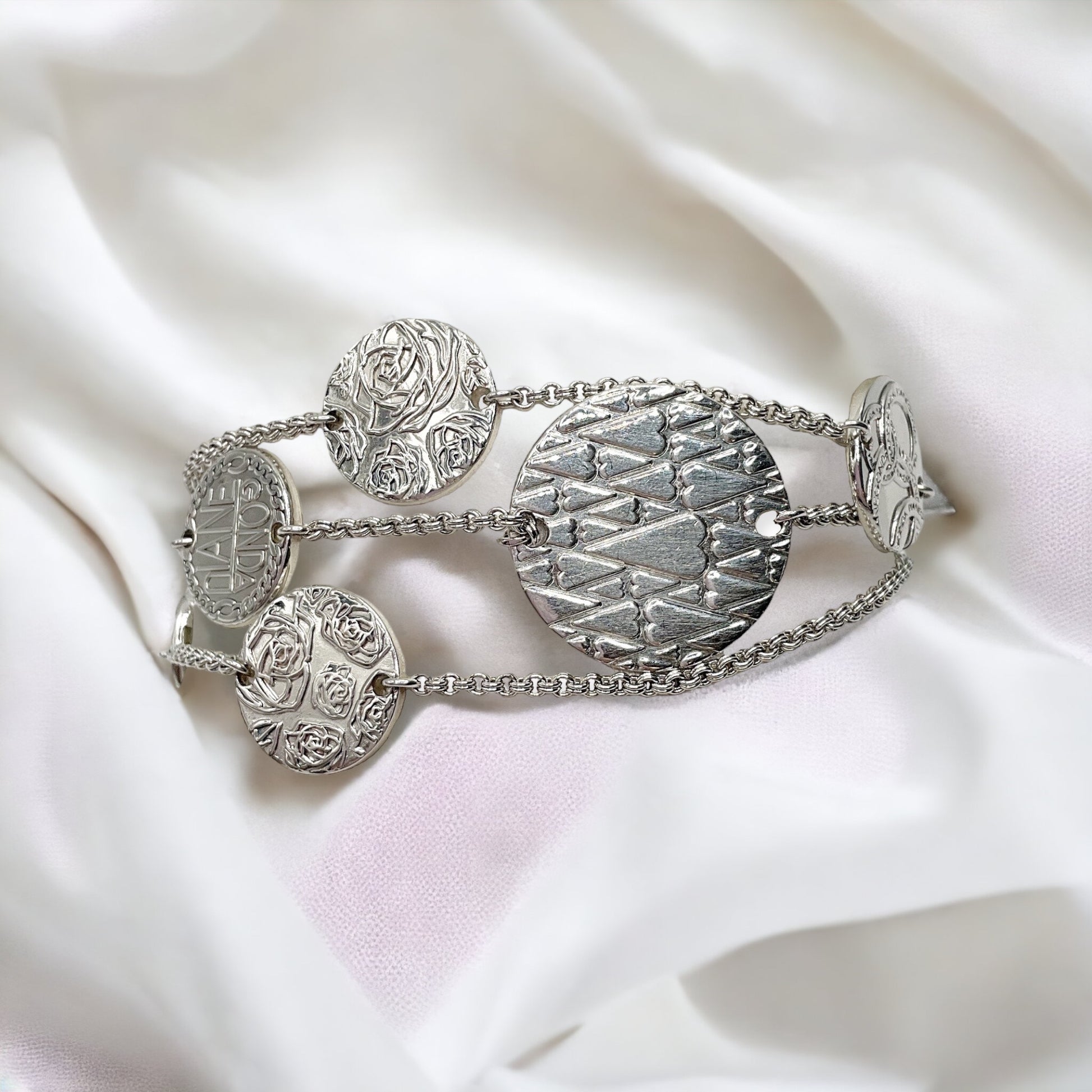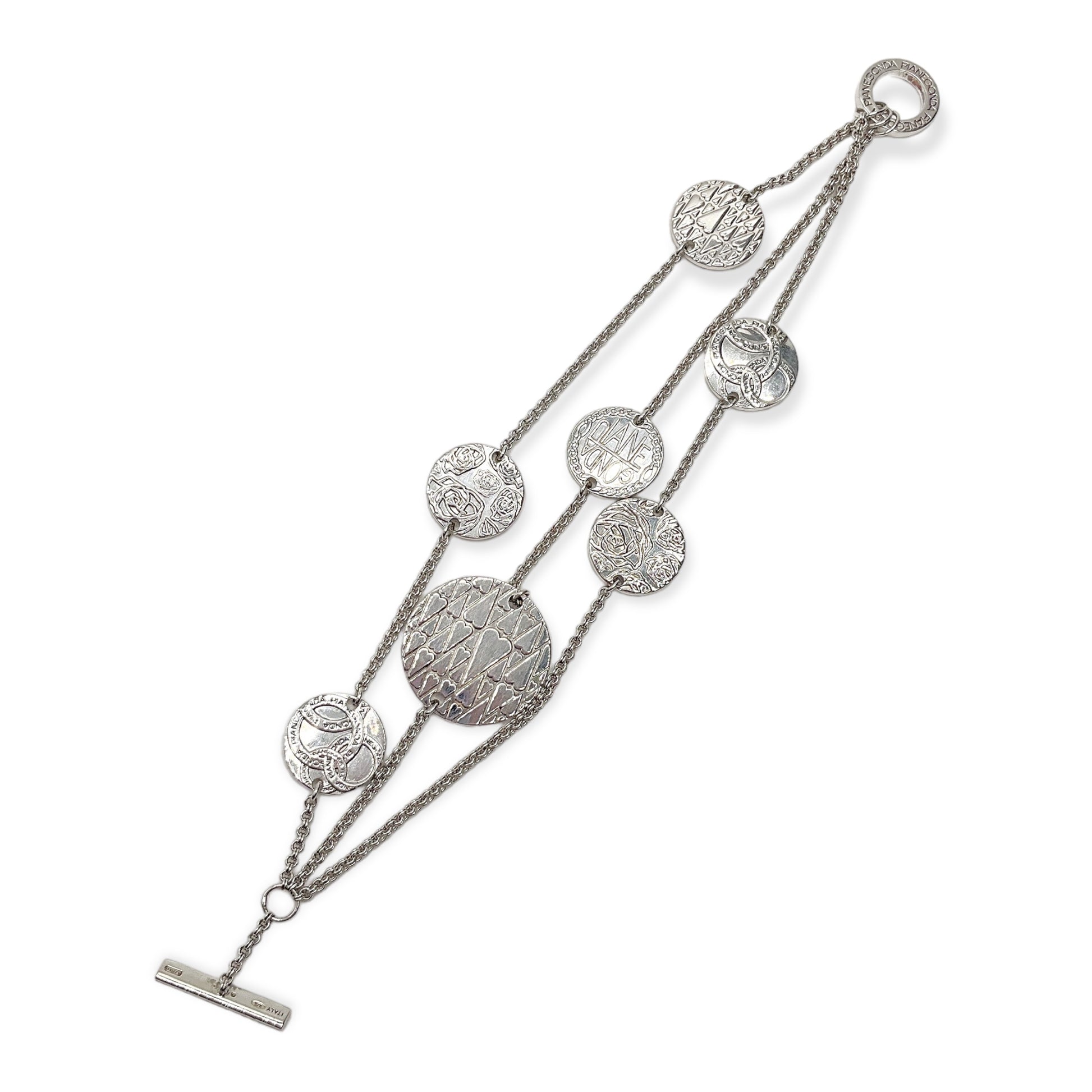 Bracciale da donna in argento della collezione Mystery. Bracciale formato da 3 catene di maglia rolò intervallate dame d’aglio di diverse dimensioni e decorazioni.