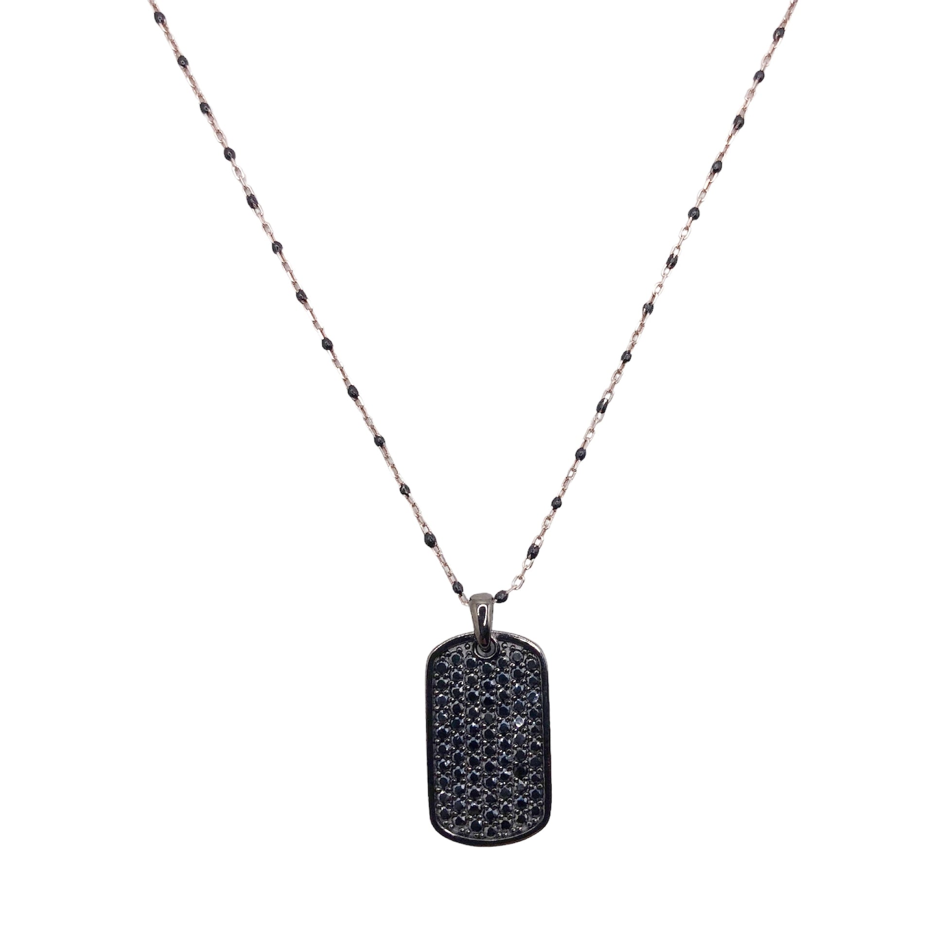 Collana realizzata in argento con pietrine tonde di colore nero. Ciondolo a medaglietta in argento impreziosito da pietre nere