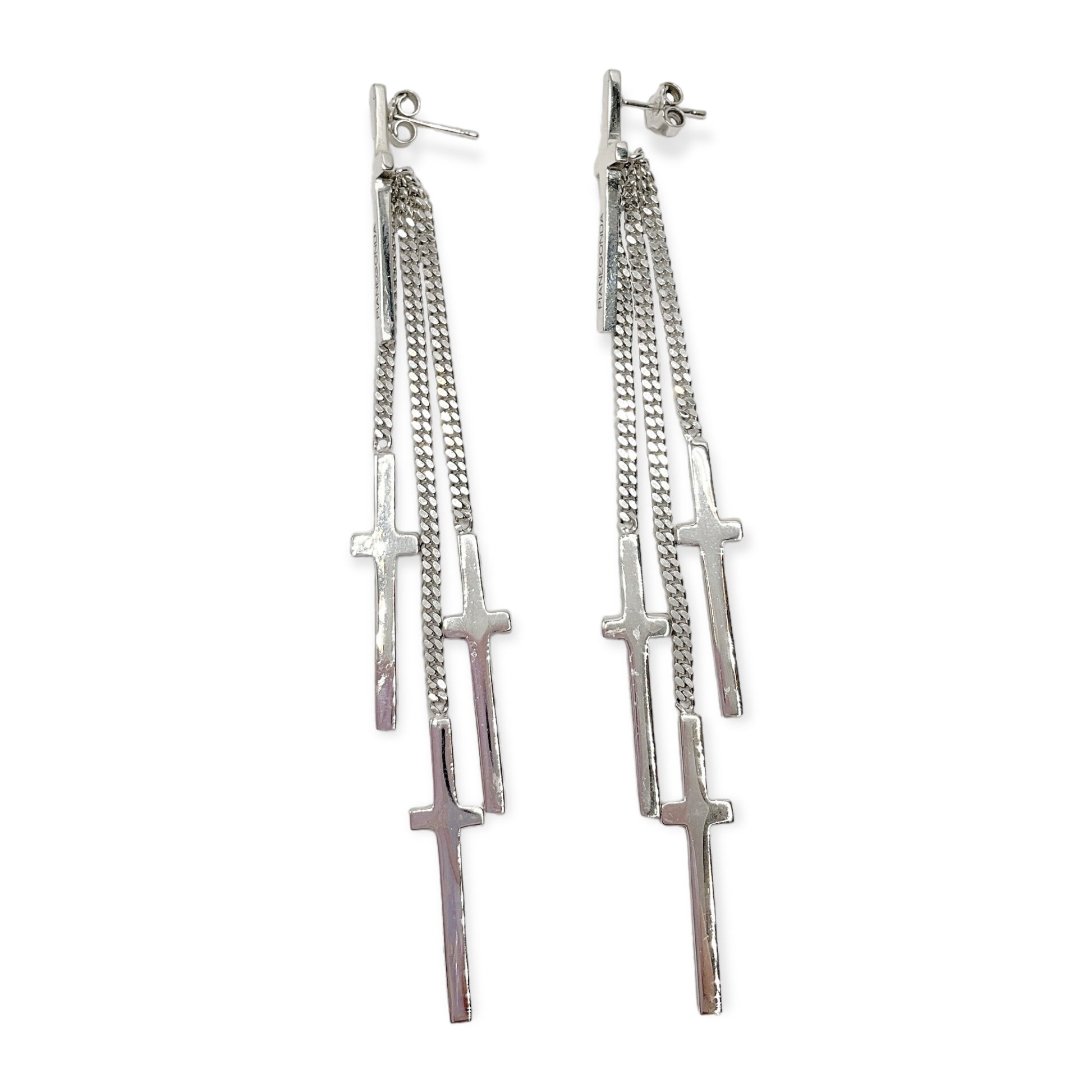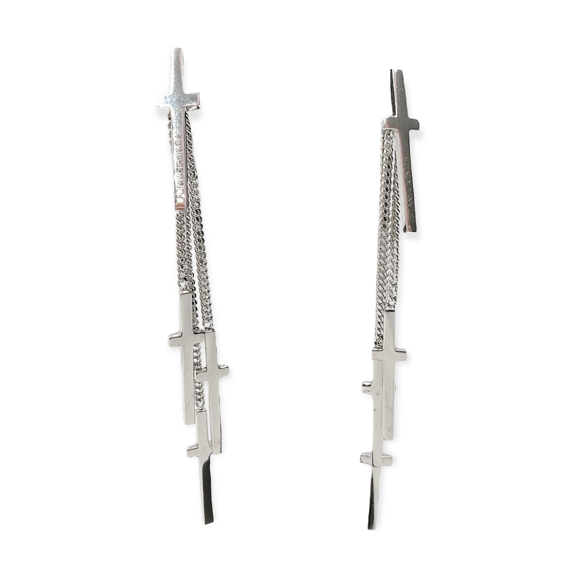 Orecchini pendenti da donna in argento, croce al lobo, catene groumette di diverse lunghezze con croce pendente.