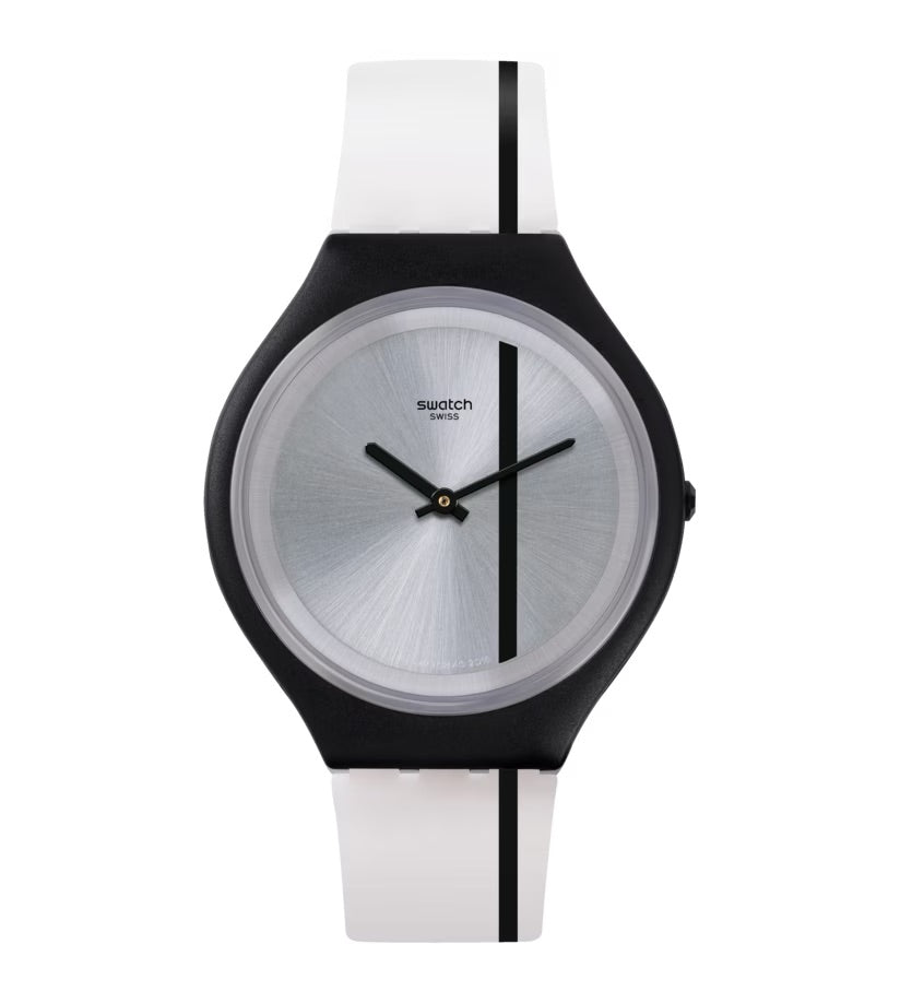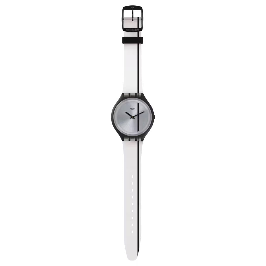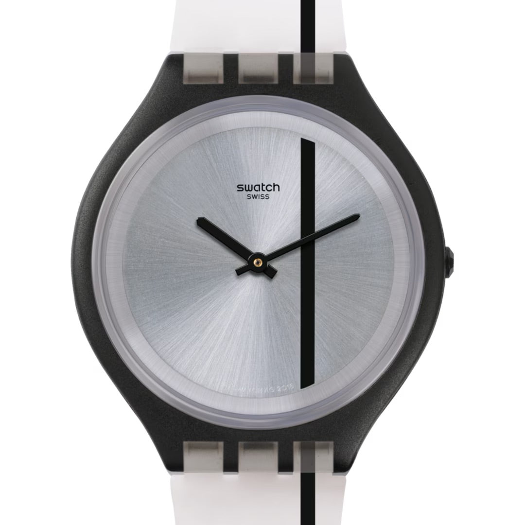 Orologio solo tempo unisex di Swatch della collezione Skin SkinThrough. Cassa in plastica opaca nera ultra piatta del diametro di 40 mm, quadrante silver con riga nera e sfere nere, cinturino in silicone opaco trasparente e riga nera, chiusura fibbia in plastica. Resistenza all'acqua 3 atm. Movimento al quarzo Swiss Made.