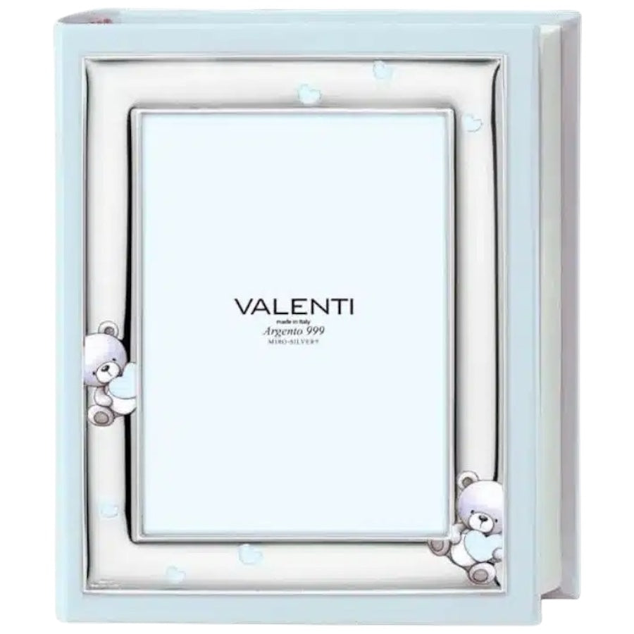 Album con cornice portafoto di Valenti con lastra in argento decorata con orsetti e cuori rosa o azzurri, album in simil pelle.