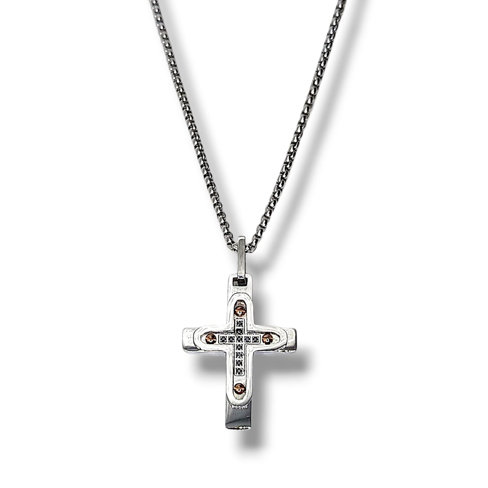 L'articolo presenta una raffinata catena rolo da 24 cm in acciaio inox, impreziosita da un pendente a croce con al centro degli spinelli neri e 4 viti in acciaio PVD gold, mentre la chiusura a moschettone garantisce sicurezza ed eleganza.
