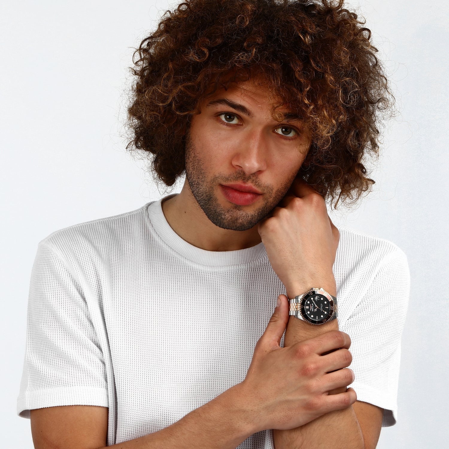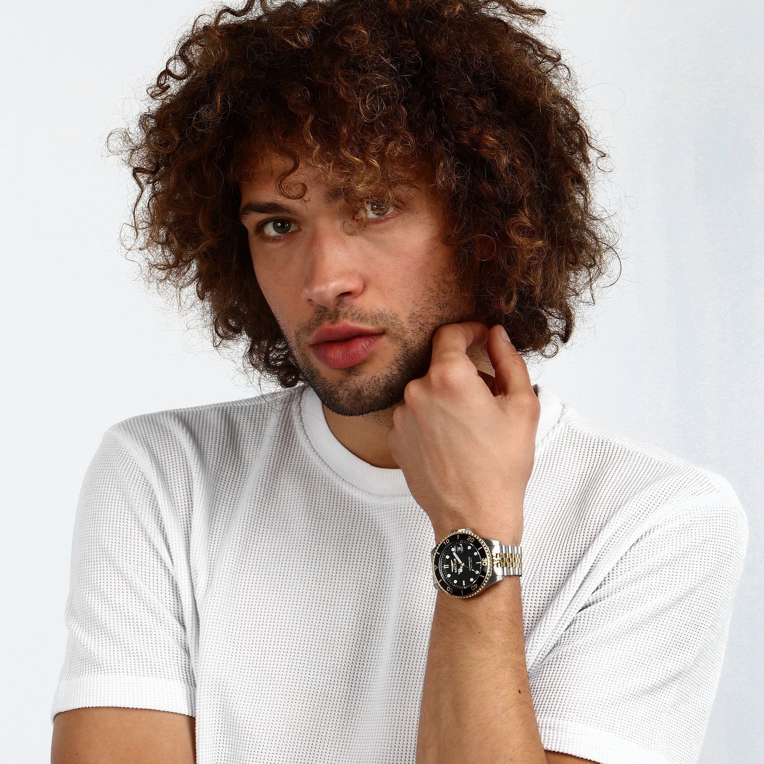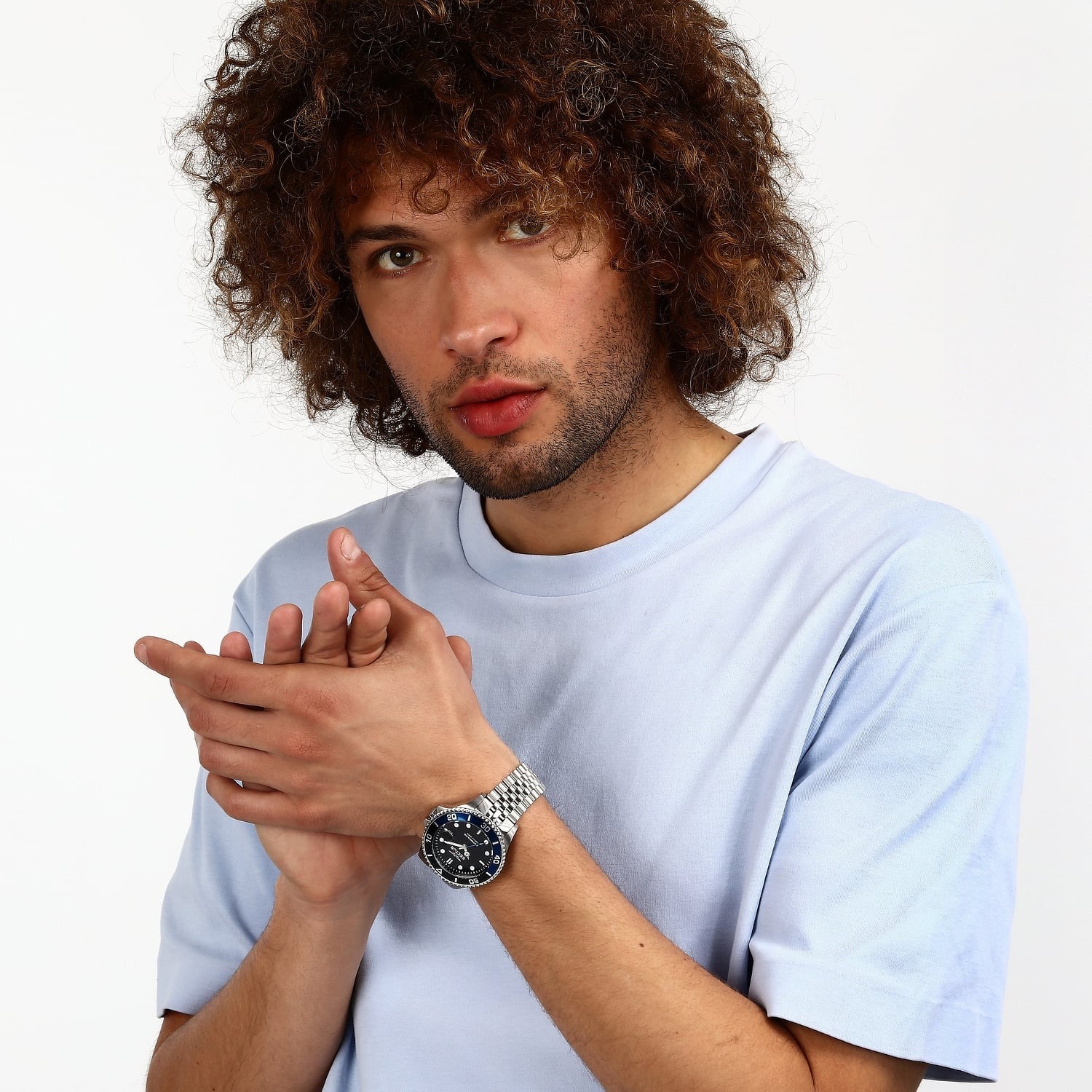 Orologio automatico solo tempo uomo di Sector della collezione 230. Cassa in acciaio del diametro di 43 mm, quadrante nero con ghiera blu e nera. Cinturino in acciaio con chiusura diver con pulsanti e chiusura di sicurezza. Movimento automatico solo tempo. Vetro minerale con trattamento zaffiro. Resistenza all'acqua di 10 atm.