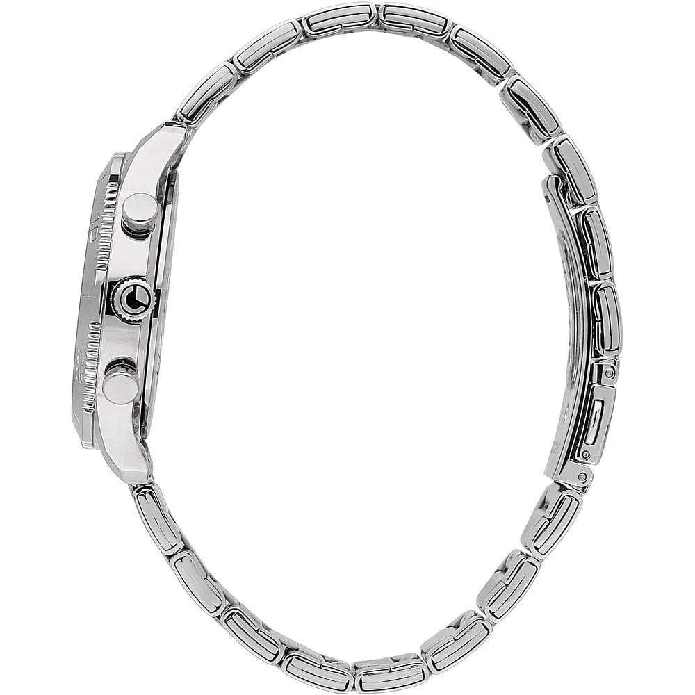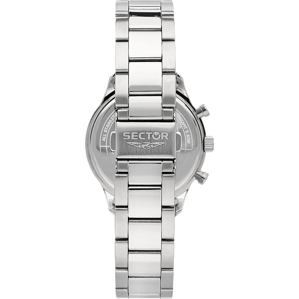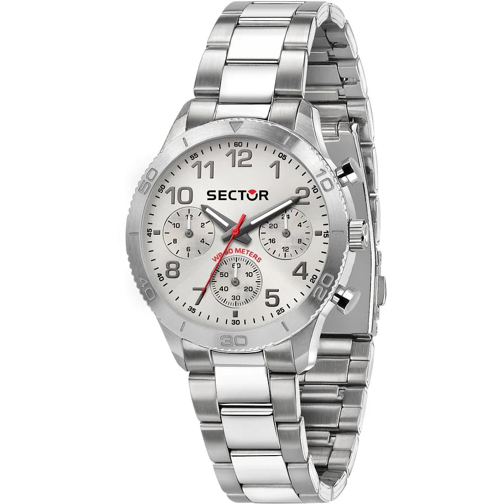 Orologio da uomo multifunzione della Sector realizzato con cinturino in acciaio inox con chiusura a deployante a pulsanti. Cassa rotonda da 30 mm di diametro, quadrante bianco con elementi in acciaio e numeri neri. Funzione cronografo, resistenza all'acqua fino a 5 bar