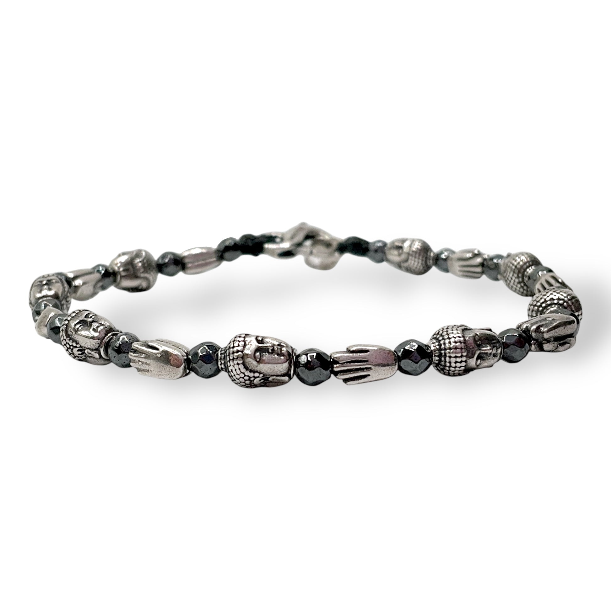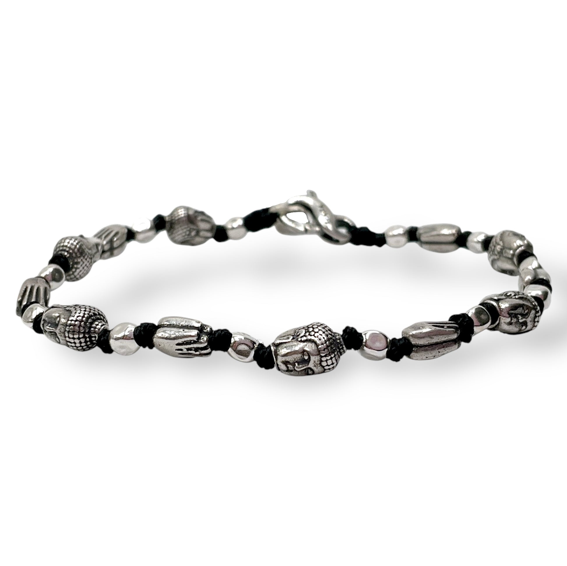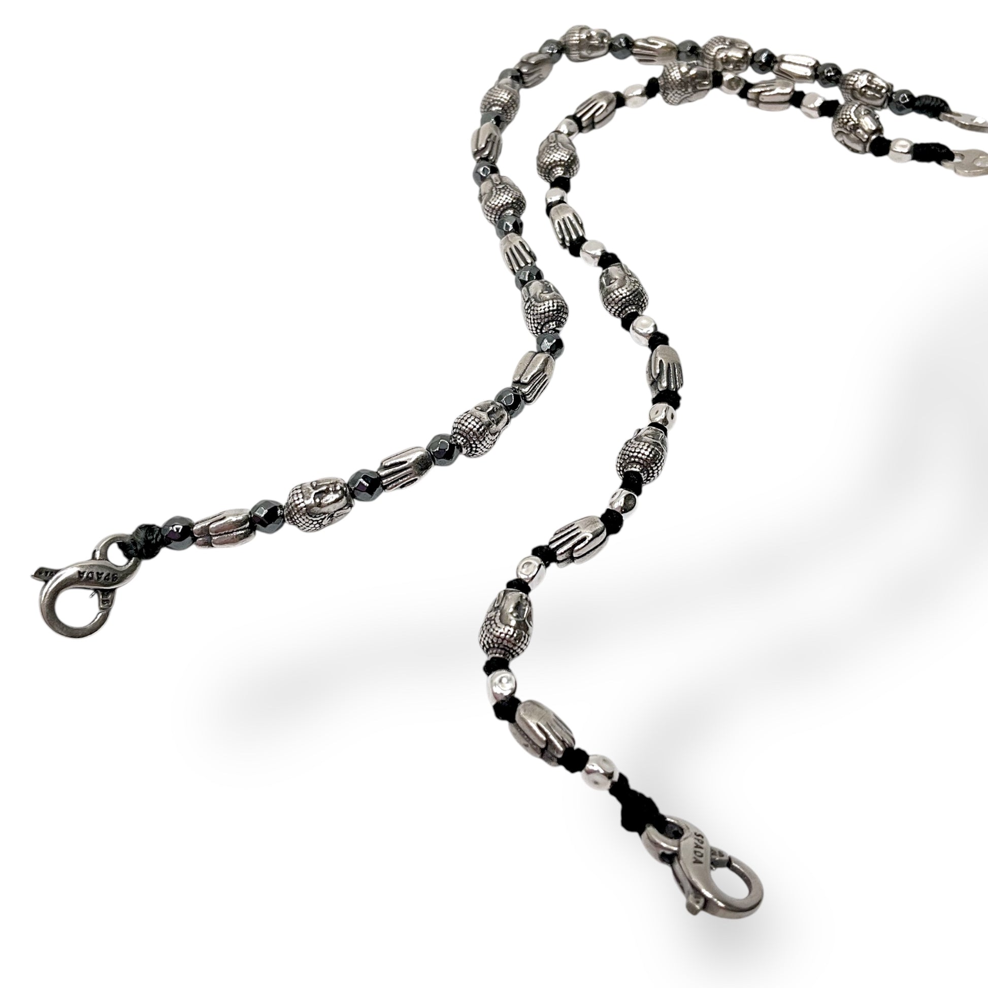 Bracciale spadino con dettagli in argento 925 e sfera da 3 mm in argento schiacciata o pietre di ematite grigio scuro sfaccettate di 3 mm e resistente filo di nylon.