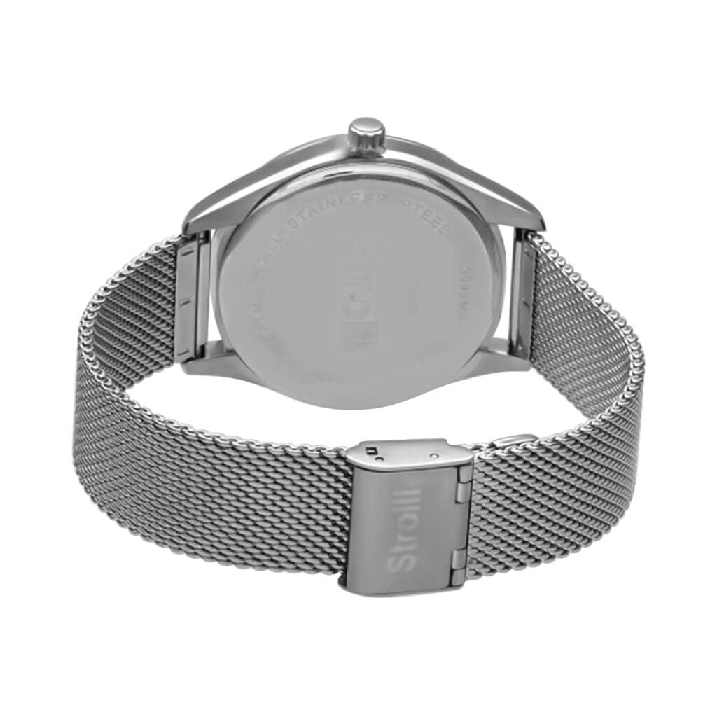 Orologio da uomo Stoili con meccanismo al Quarzo, realizzato in acciaio inox con cinturino semirigido in maglia Milano e chiusura regolabile. Cassa rotonda da 41 mm con spessore 8 mm, quadrante silver dalla finitura satinata con indici e lancette color oro rosa. Datario alle ore 3, vetro minerale e resistenza all'acqua fino a 3 atm.