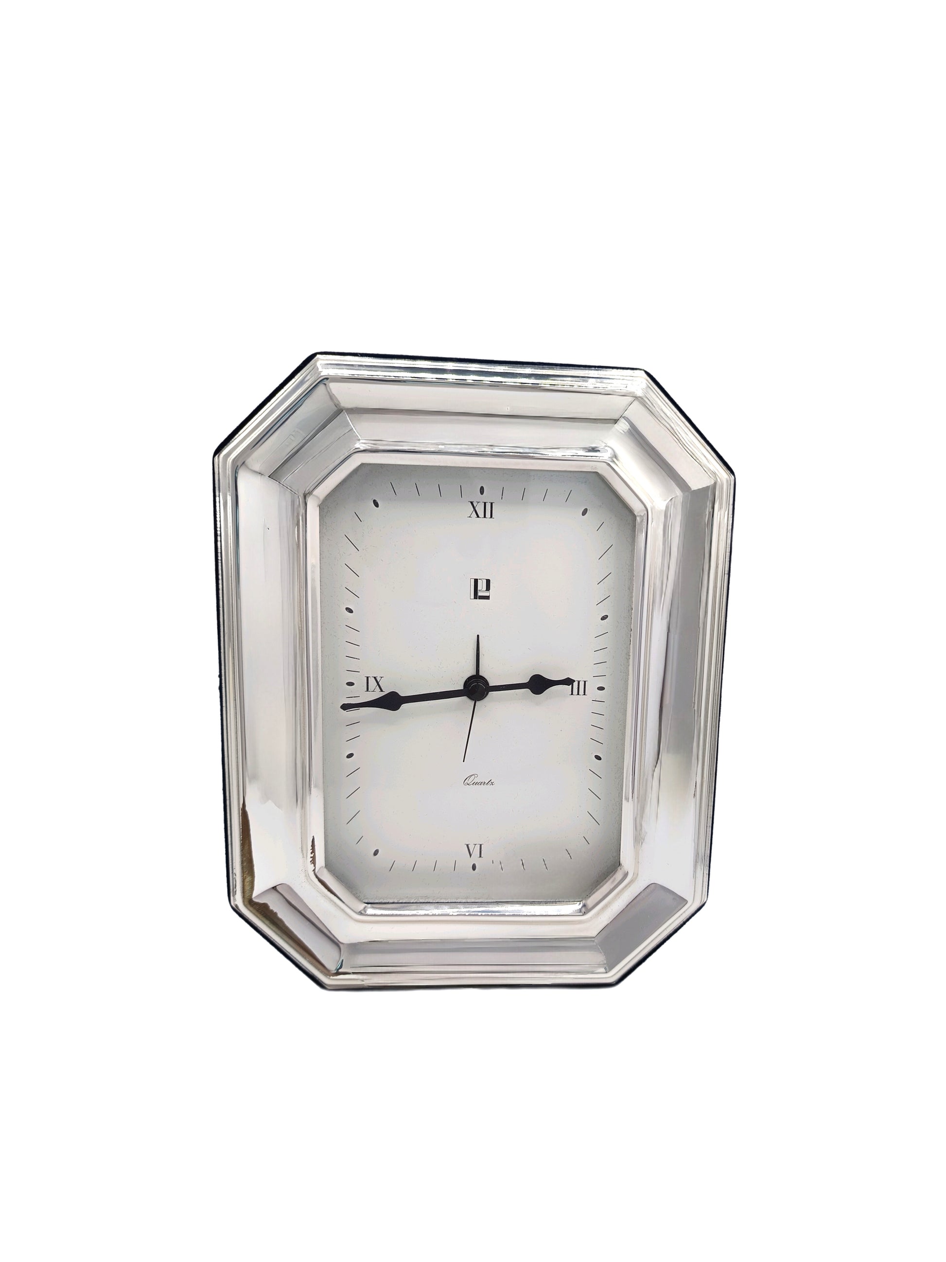 Orologio da tavolo dal design raffinato ed elegante realizzato in argento 925 con funzione sveglia. Dimensione prodotto: 14 x 18 cm