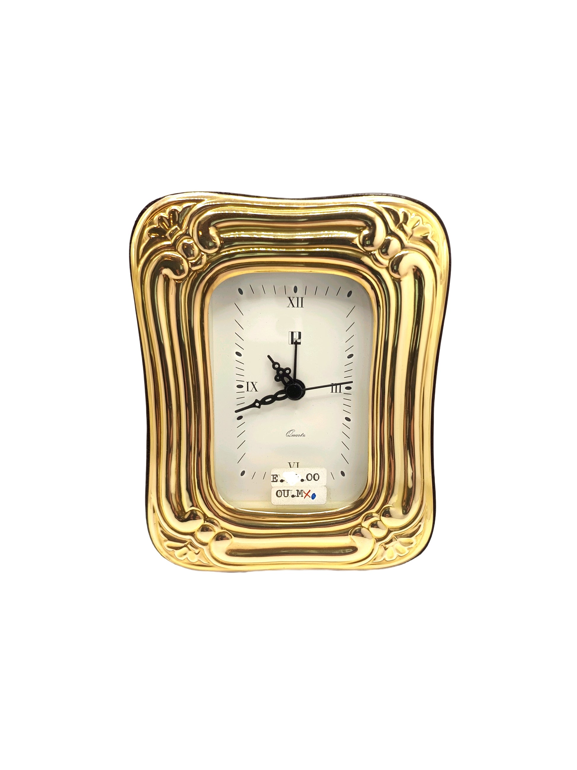 Orologio da tavolo realizzato in argento dalla finitura dorata con funzione sveglia. Dimensione prodotto: 11 x 14, cm
