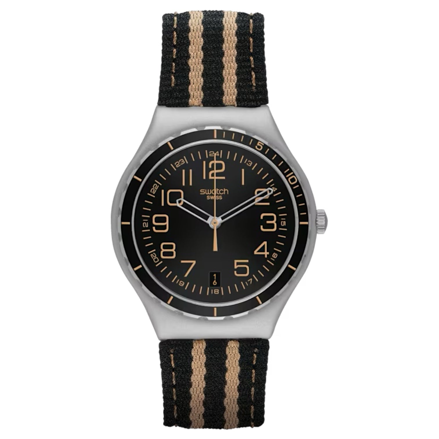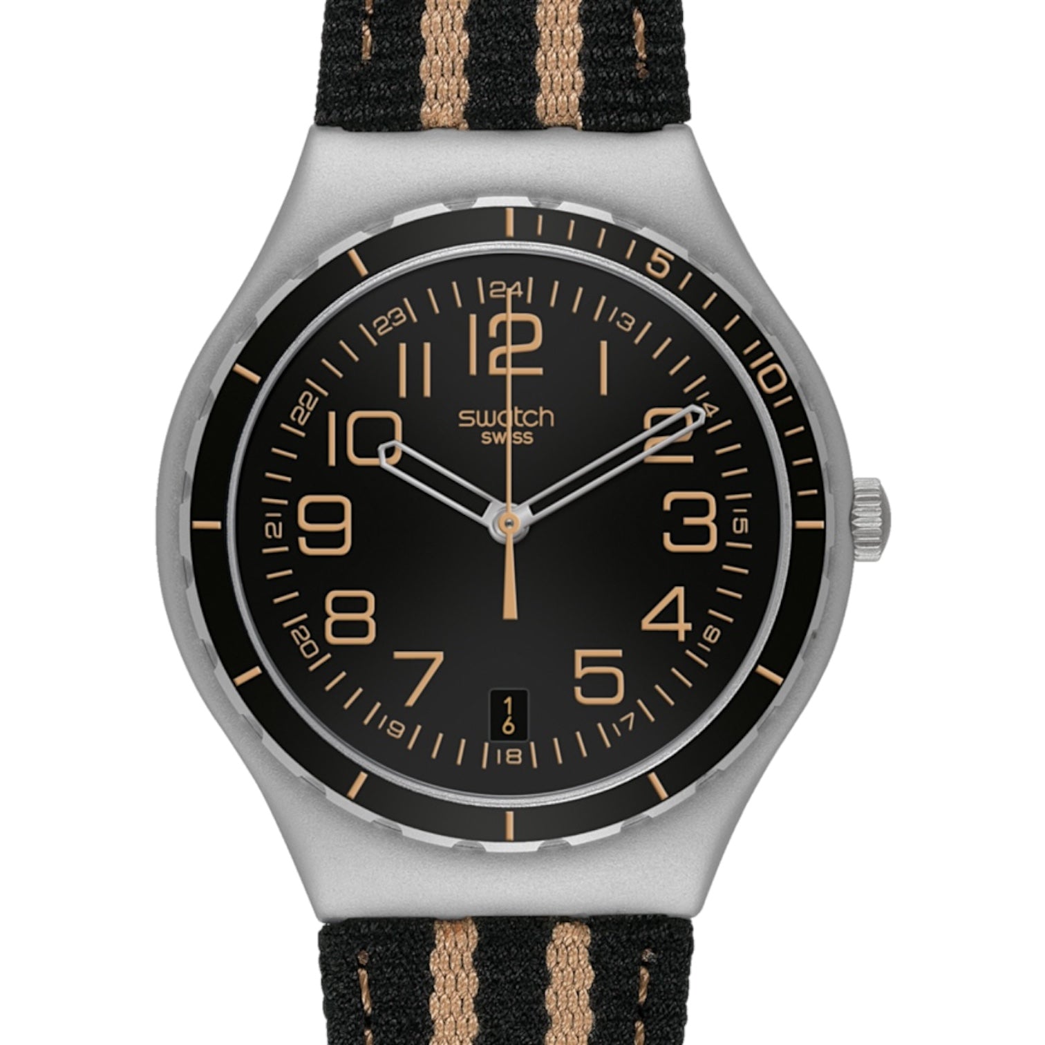 Orologio solo tempo uomo di Swatch della collezione Irony Alluminio Le Compte de Lignes. Cassa in alluminio del diametro di 37,40 mm, quadrante nero con numeri e indici beige, sfere silver e beige, cinturino in cordura nero e beige, chiusura fibbia in alluminio. Resistenza all'acqua 3 bar. Movimento al quarzo Swiss Made.