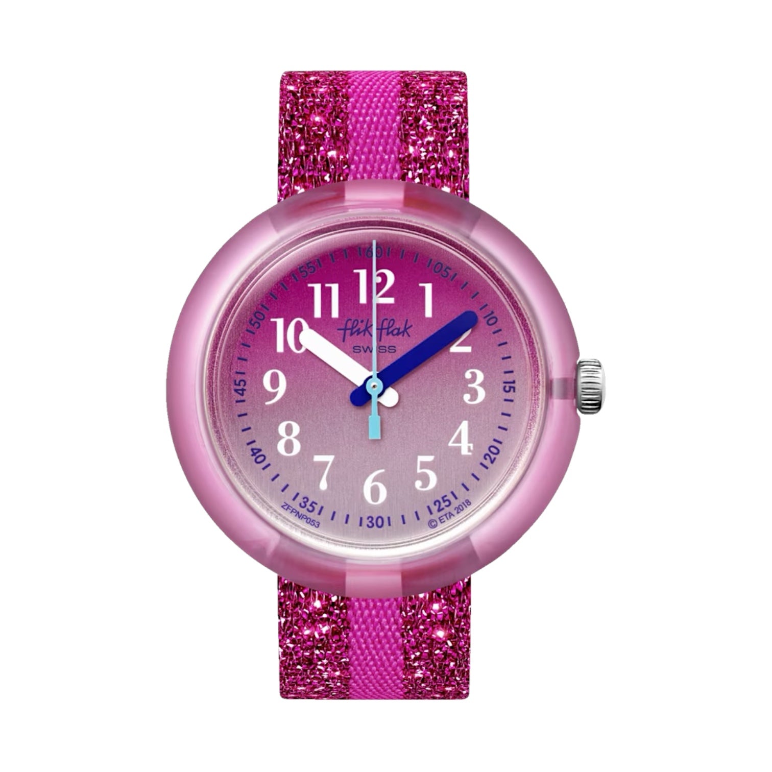 Orologio solo tempo da bambina di Flik Flak Pink Sparkle. Cassa in plastica trasparente rosa del diametro di 31,85 mm, quadrante metalizzato rosa sfumato, numeri bianchi e blu, sfere bianca e blu, cinturino in tessuto impermeabile fucsia con filo di lurex, chiusura fibbia in plastica. Resistenza all'acqua 3 atm. Movimento al quarzo Swiss Made.