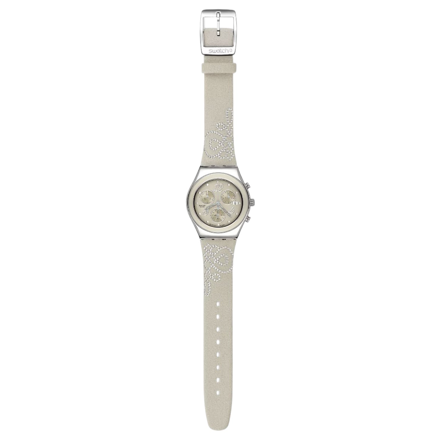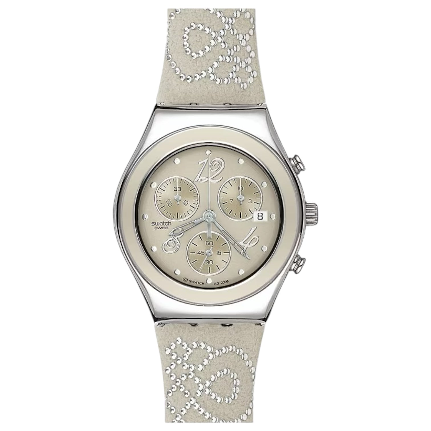 Orologio cronografo da donna di Swatch della collezione Irony Lady Magic Affection. Cassa in acciaio lucido del diametro di 35,2 mm, quadrante beige, indici e numeri silver, sfere silver, cinturino in pelle e velluto con piccole borchie che formano un disegno, chiusura fibbia in acciaio. Resistenza all'acqua 3 bar. Movimento al quarzo Swiss Made.