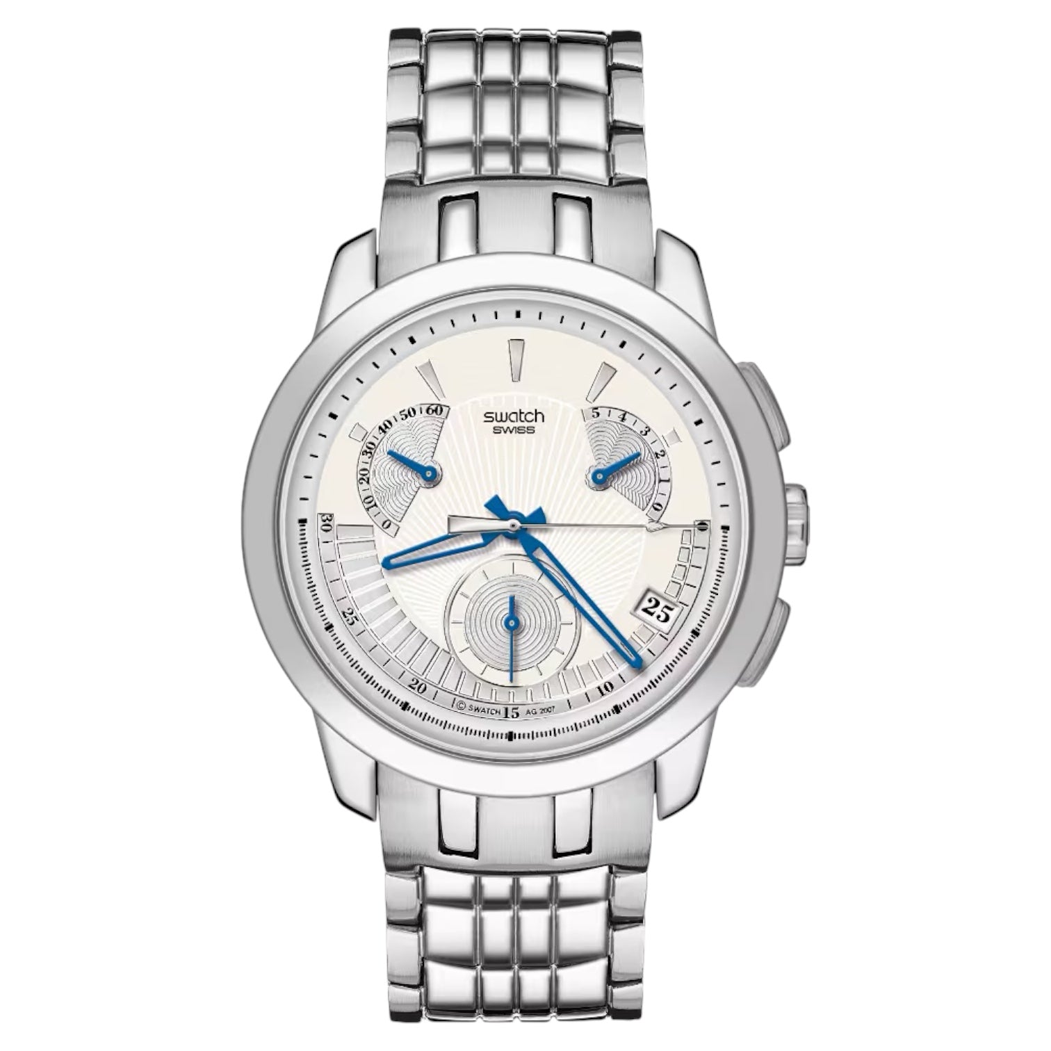 Orologio cronografo da uomo di Swatch della collezione Irony Retrograde Blue Signs. Cassa in acciaio lucido del diametro di 41,5 mm, quadrante bianco e indici bianchi e silver, sfere silver e blu, cinturino in acciaio, chiusura di sicurezza in acciaio. Resistenza all'acqua 3 bar. Movimento al quarzo Swiss Made.