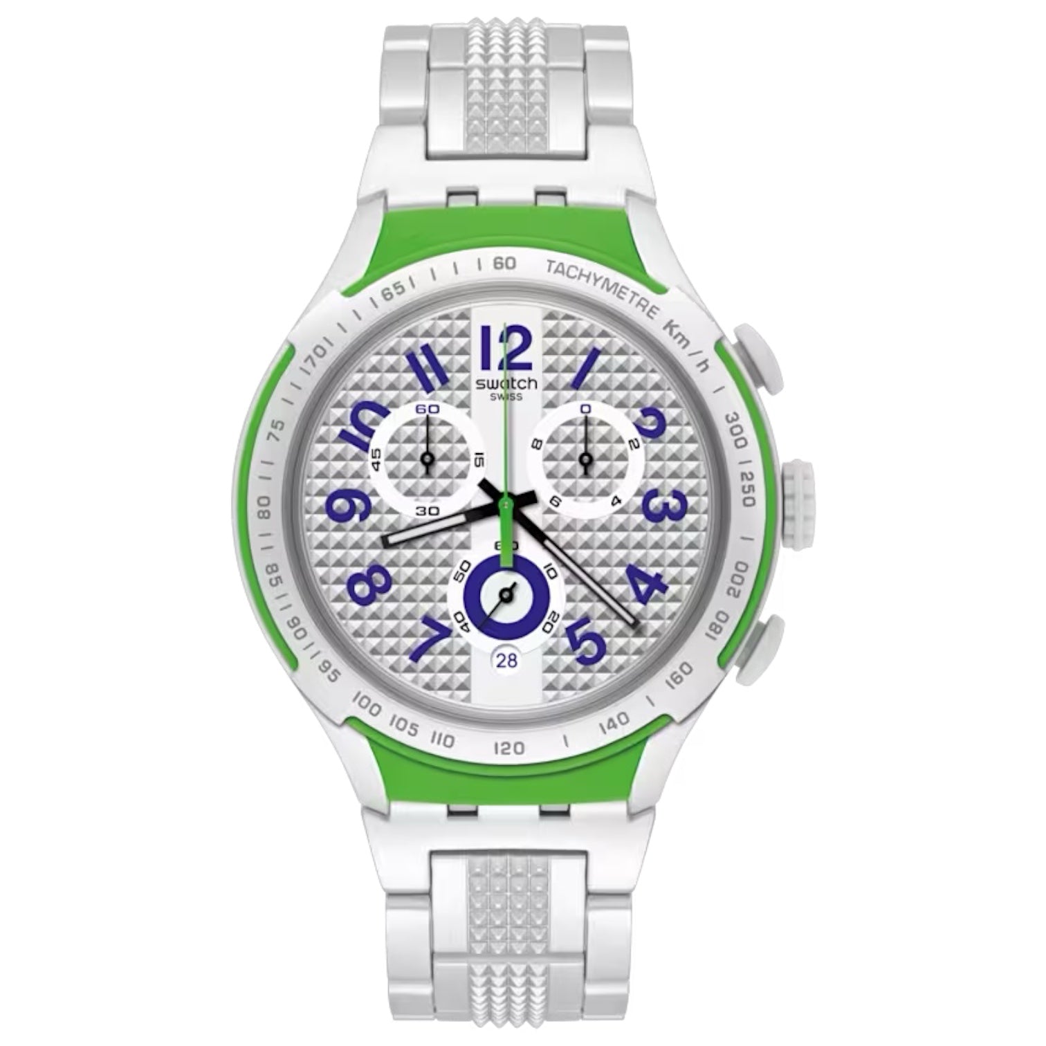 Orologio cronografo uomo di Swatch della collezione Irony X-Lite Electric Ride. Cassa in alluminio satinato con inserti in plastica verde fluo del diametro di 45 mm, quadrante silver con numeri blu, sfere nere, bianche e verde fluo, cinturino in alluminio nella parte centrale piccole piramidi, chiusura di sicurezza in alluminio. Resistenza all'acqua 3 bar. Movimento al quarzo Swiss Made.
