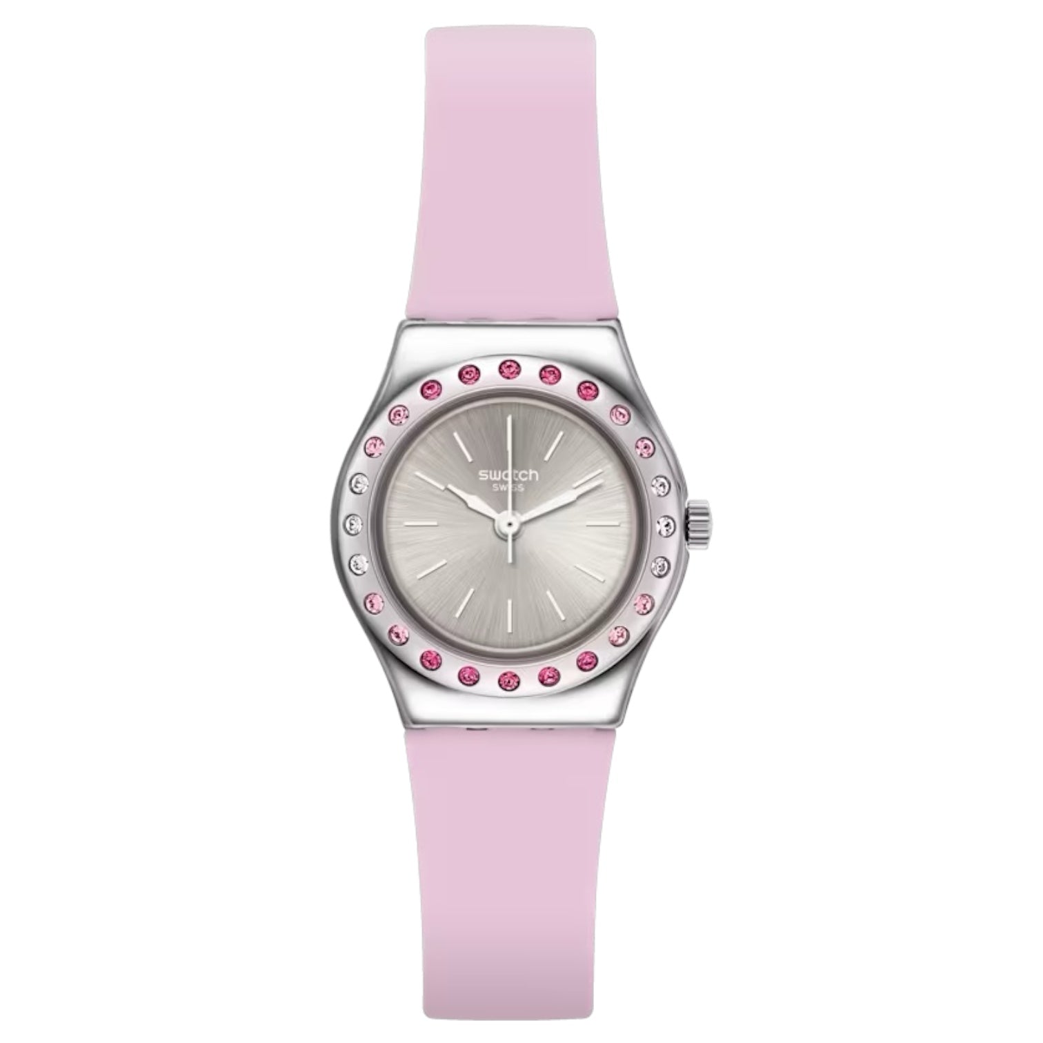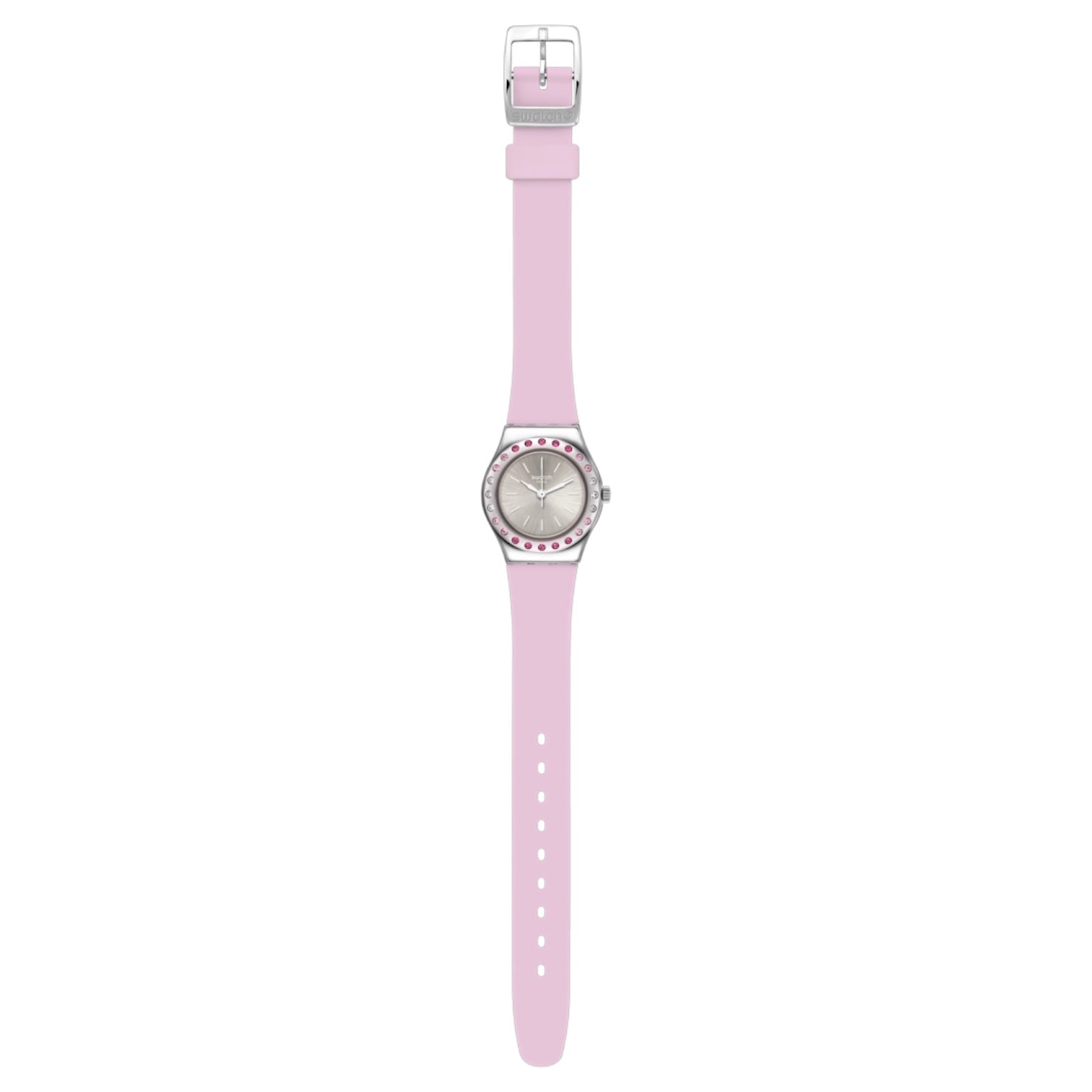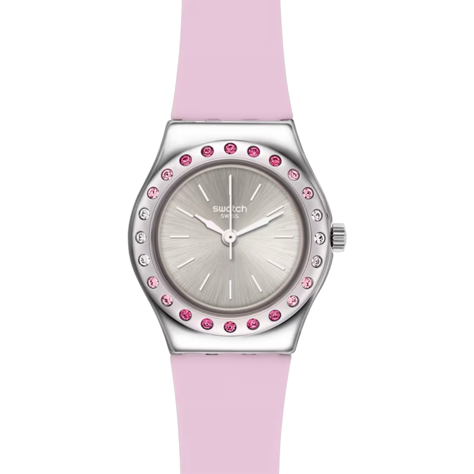 Orologio solo tempo da donna o bambina di Swatch della collezione Irony Mini Camapink. Cassa in acciaio lucido del diametro di 25 mm, quadrante silver con indici bianchi, sfere bianche, ghiera con cristalli rosa sfumati, cinturino in silicone rosa, chiusura fibbia in acciaio. Resistenza all'acqua 3 bar. Movimento al quarzo Swiss Made.
