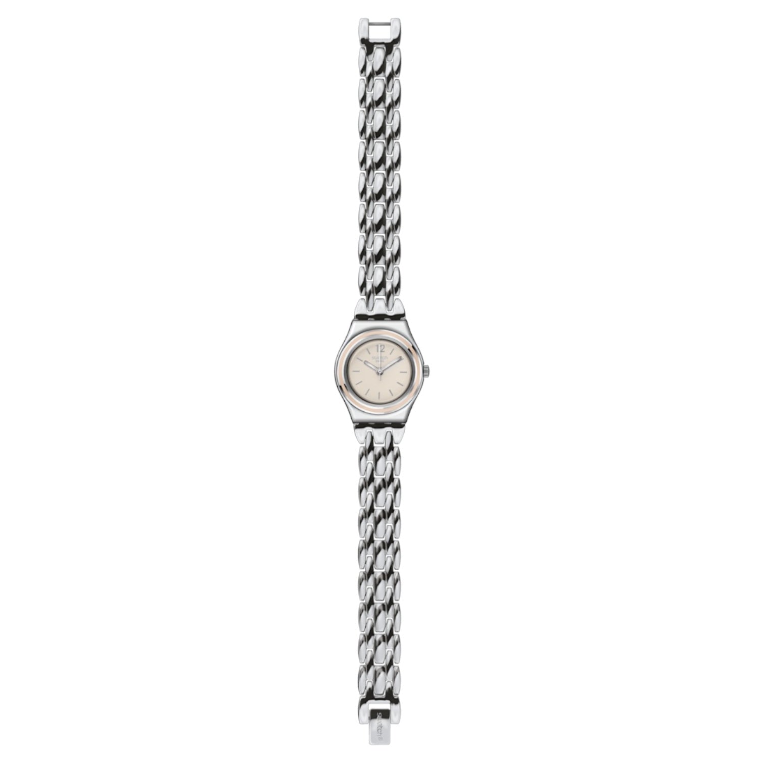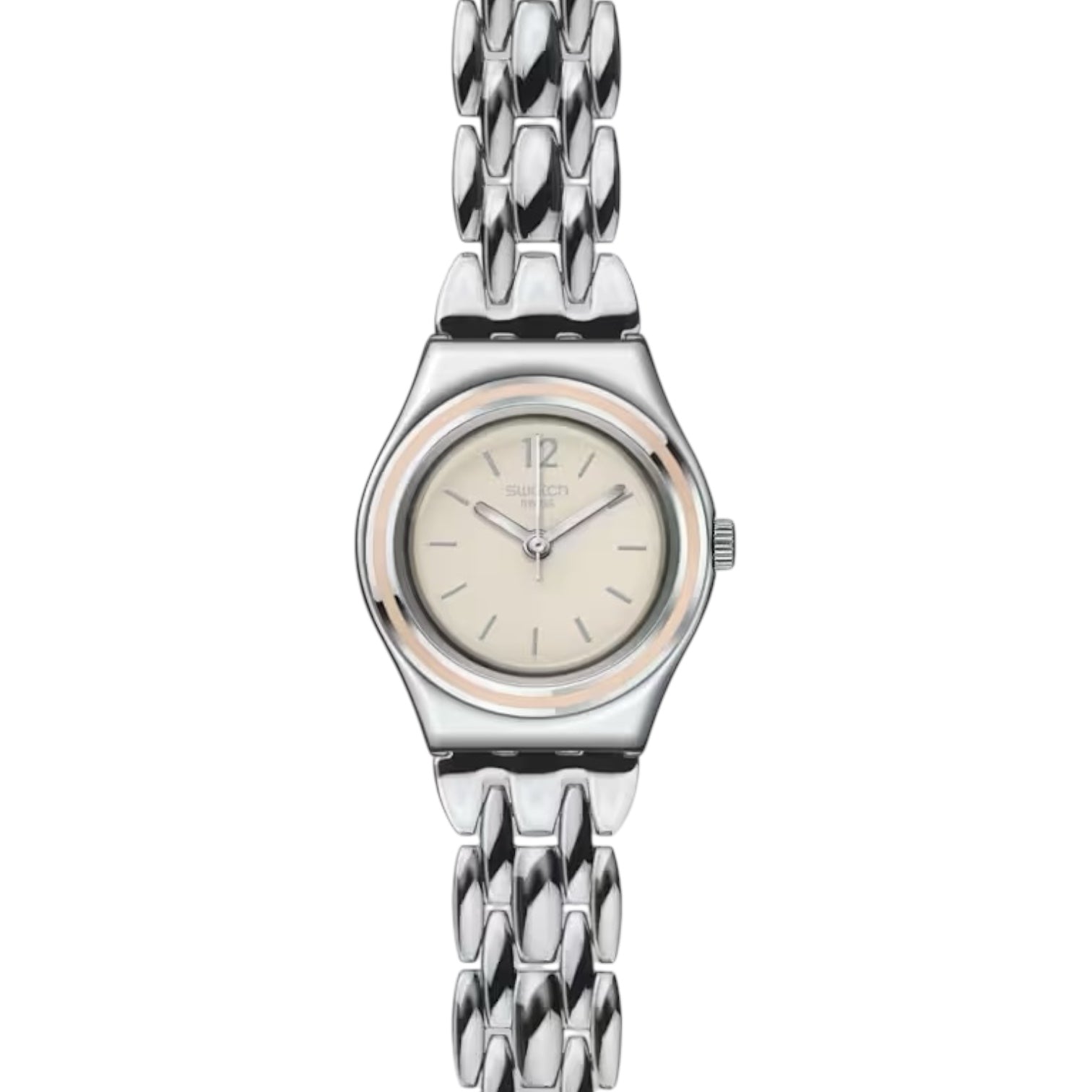 Orologio solo tempo da donna o bambina di Swatch della collezione Irony Discretly. Cassa in acciaio lucido del diametro di 25 mm, quadrante avorio con indici e numeri silver, sfere silver, ghiera smaltata rosa, cinturino in acciaio, chiusura di sicurezza in acciaio. Resistenza all'acqua 3 bar. Movimento al quarzo Swiss Made.